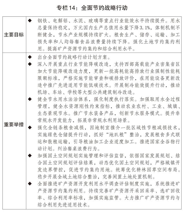 三是加快形成绿色生产生活方式。开展全面节约战略行动,持续推动“能水粮地矿材”一体化节约。推动修订节约能源法,修订重点用能和碳排放单位管理办法,开展制冷能效提升和绿色照明行动,推行公共机构能源费用托管等市场化节能模式。深化节水型社会建设,扩大非常规水利用规模,大力发展节水产业。大力开展粮食节约和反食品浪费行动。发展循环经济,提高垃圾分类和资源化利用水平,加快构建废弃物循环利用体系,加强再生材料推广使用。支持氧化铝提锂提镓。支持“以竹代塑”产业发展。设立国家低碳转型基金,培育氢能、绿色燃料等新增长点。健全绿色消费激励机制,推广绿色低碳生活方式。