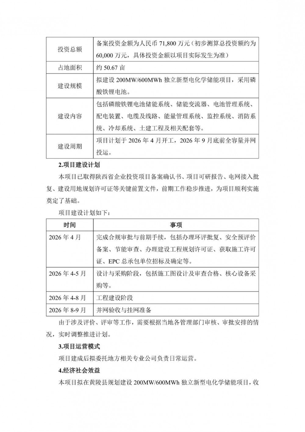 项目地点位于陕西省延安市黄陵县黄陵高新技术产业开发区,拟占地约50.67亩。本项目拟建设200MW/600MWh独立新型电化学储能项目,采用磷酸铁锂电池。包括磷酸铁锂电池储能系统、储能变流器、电池管理系统、配电装置、电缆及线路、能量管理系统、监控系统、消防系统、冷却系统、土建工程及相关配套等。
