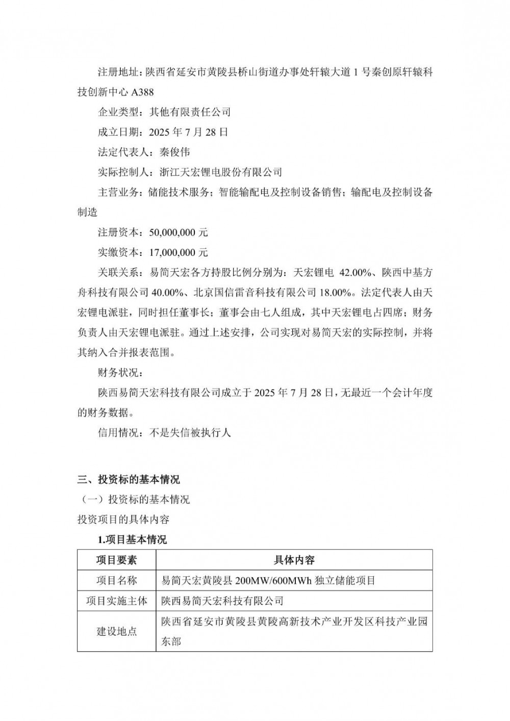 近日,天宏锂电发布公告称,为进一步发展公司独立储能项目,公司子公司陕西易简天宏科技有限公司拟投资建设易简天宏黄陵县200MW/600MWh独立储能项目。项目备案投资金额为人民币71,800万元(初步测算总投资额约为60,000万元,具体投资金额以项目实际发生为准),资金来源为企业自筹及银行贷款。