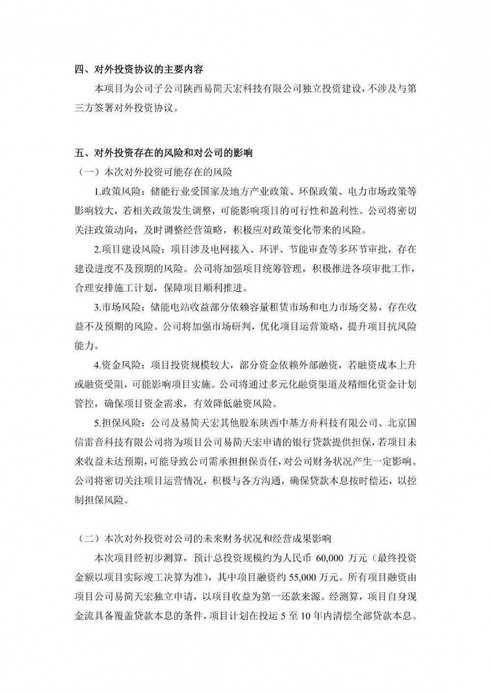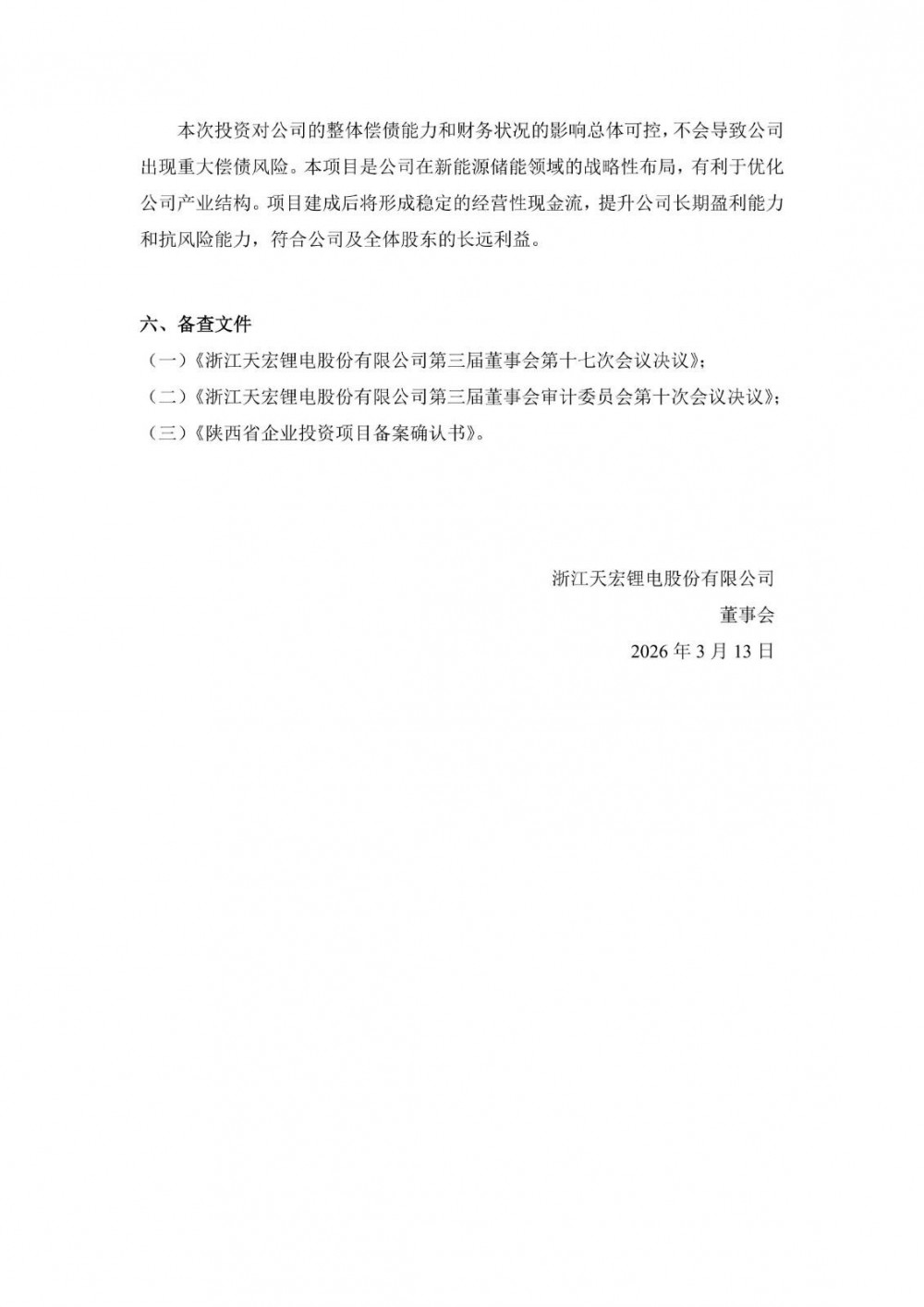 天宏锂电表示,本次投资对公司的整体偿债能力和财务状况的影响总体可控,不会导致公司出现重大偿债风险。本项目是公司在新能源储能领域的战略性布局,有利于优化公司产业结构。项目建成后将形成稳定的经营性现金流,提升公司长期盈利能力和抗风险能力,符合公司及全体股东的长远利益。