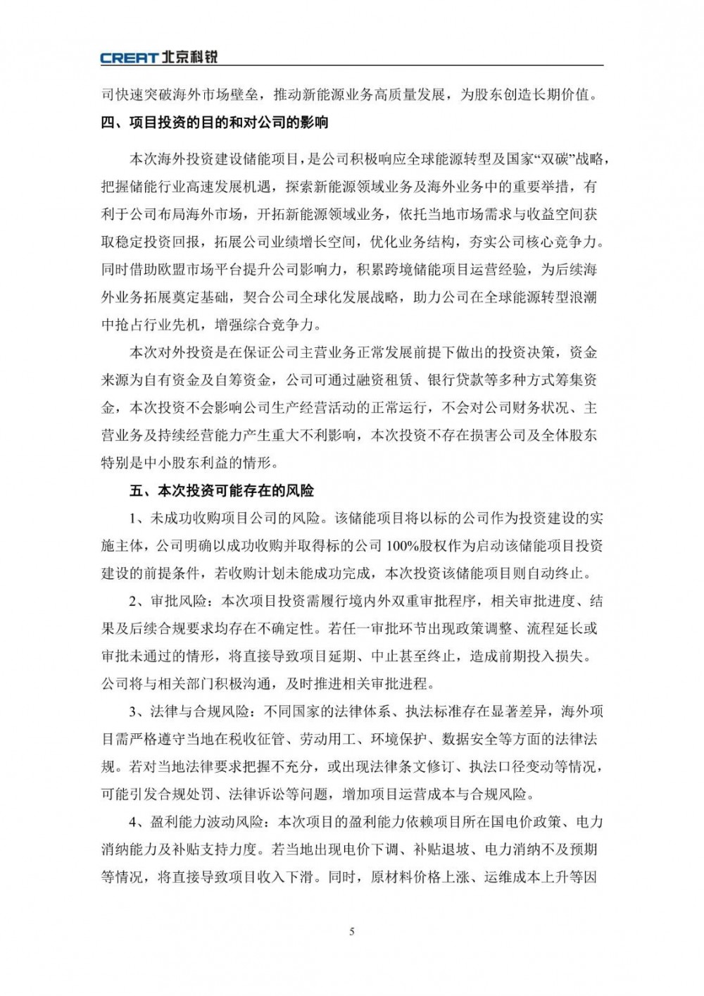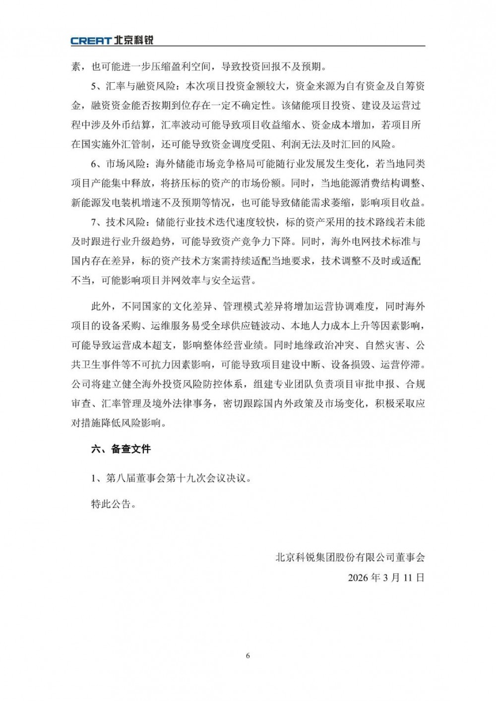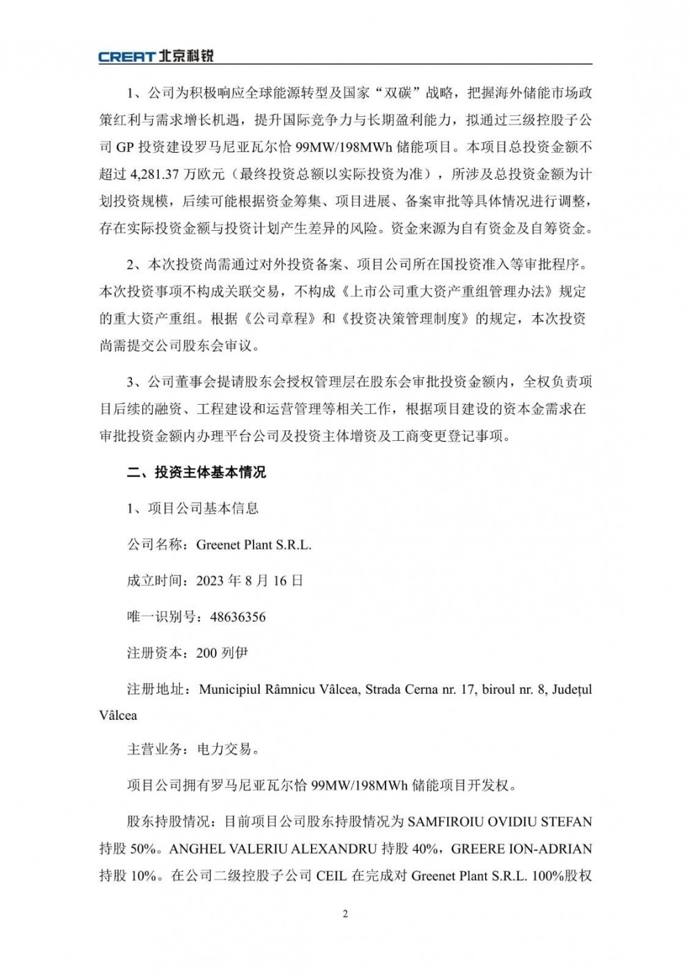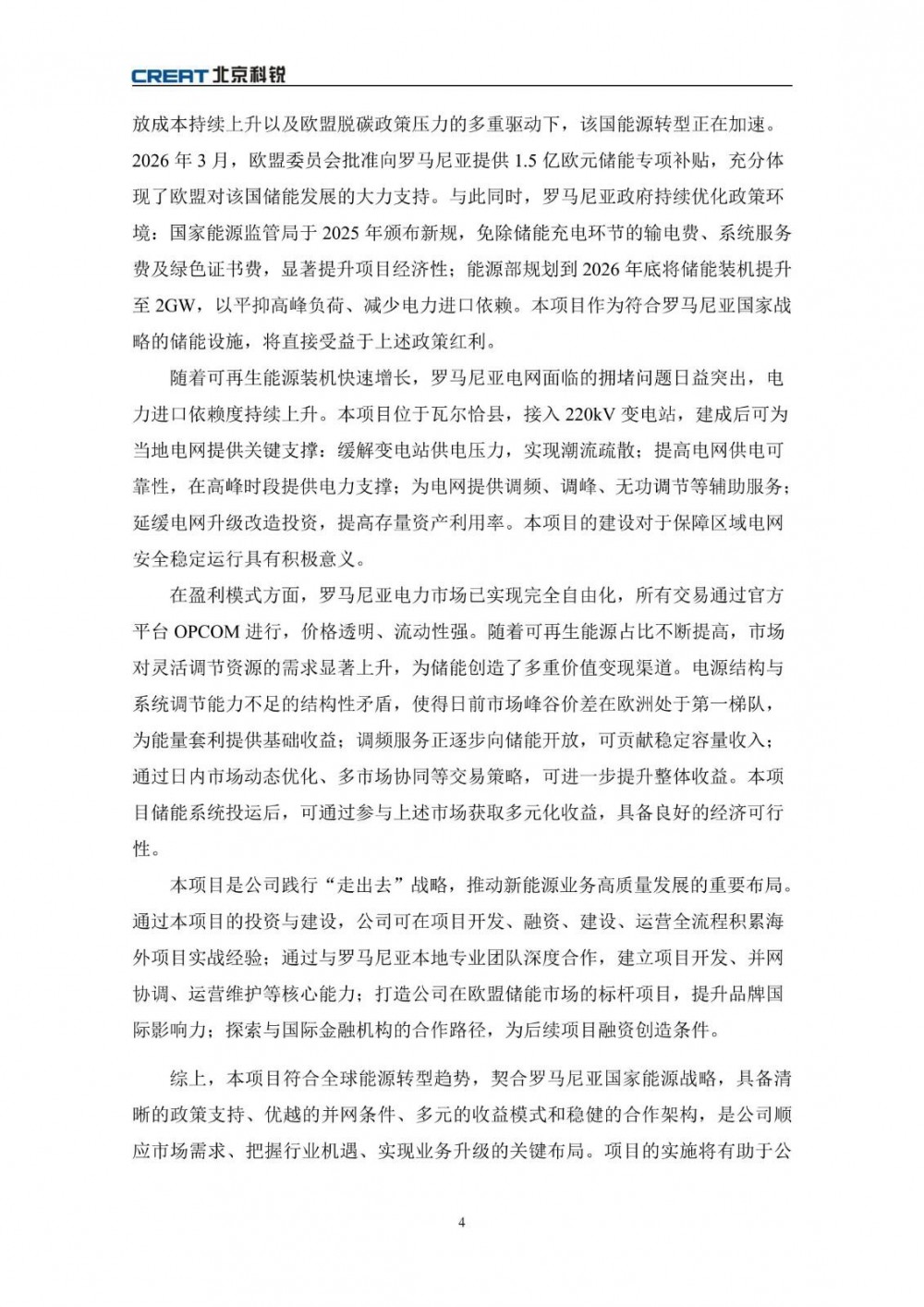 北京科锐表示,本项目是公司践行“走出去”战略,推动新能源业务高质量发展的重要布局。通过本项目的投资与建设,公司可在项目开发、融资、建设、运营全流程积累海外项目实战经验;通过与罗马尼亚本地专业团队深度合作,建立项目开发、并网协调、运营维护等核心能力;打造公司在欧盟储能市场的标杆项目,提升品牌国际影响力;探索与国际金融机构的合作路径,为后续项目融资创造条件。