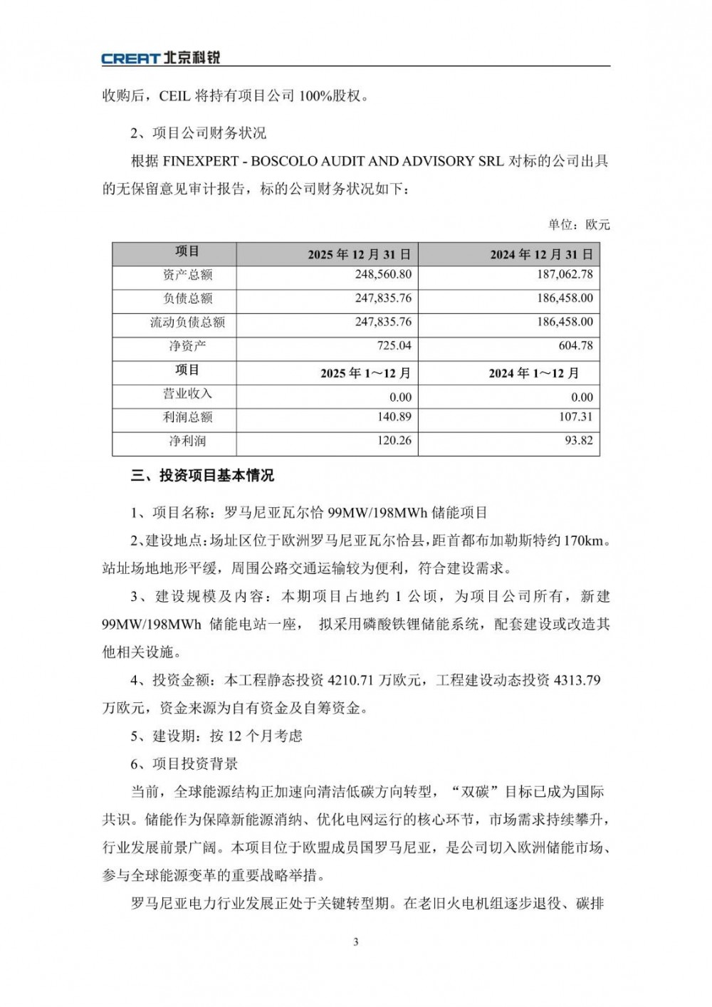 近日,北京科锐发布公告称,公司为积极响应全球能源转型及国家“双碳”战略,把握海外储能市场政策红利与需求增长机遇,提升国际竞争力与长期盈利能力,拟通过三级控股子公司GP投资建设罗马尼亚瓦尔恰99MW/198MWh储能项目。本项目总投资金额不超过4,281.37万欧元(最终投资总额以实际投资为准),所涉及总投资金额为计划投资规模,后续可能根据资金筹集、项目进展、备案审批等具体情况进行调整,存在实际投资金额与投资计划产生差异的风险。资金来源为自有资金及自筹资金。