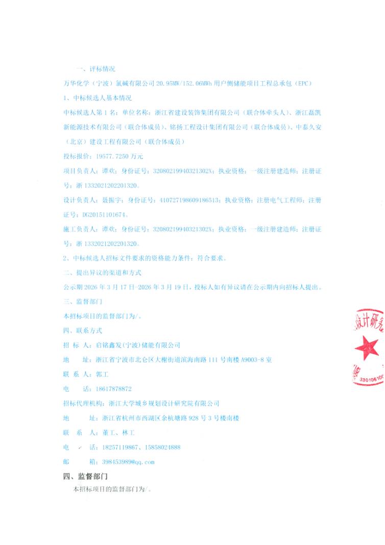 3月16日,万华化学(宁波)氯碱有限公司20.95MW/152.06MWh用户侧储能项目工程总承包(EPC)中标候选人公示。