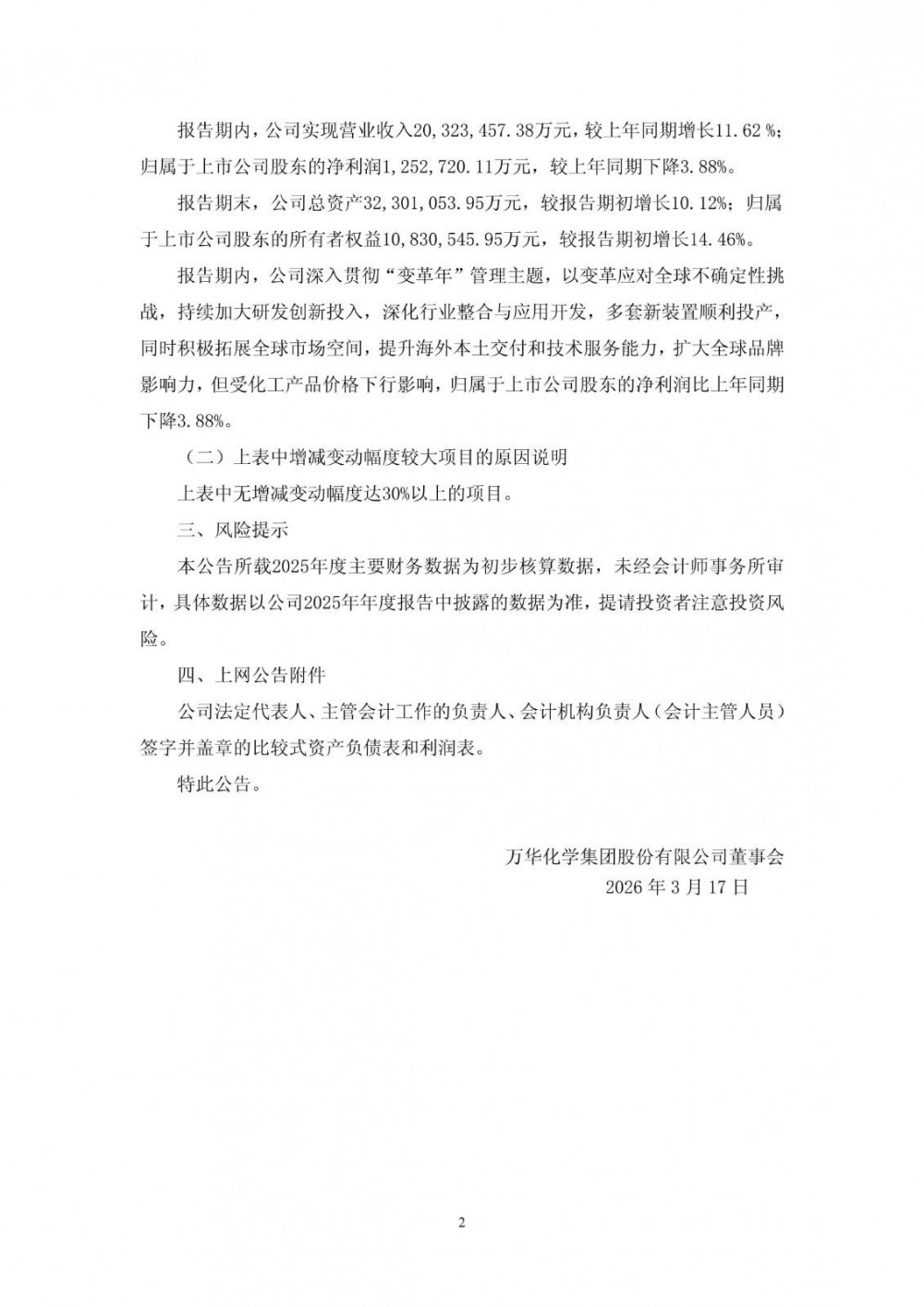 3月16日,万华化学发布公告称,报告期内,公司实现营业收入20,323,457.38万元,较上年同期增长11.62 %;归属于上市公司股东的净利润1252720.11万元,较上年同期下降3.88%。