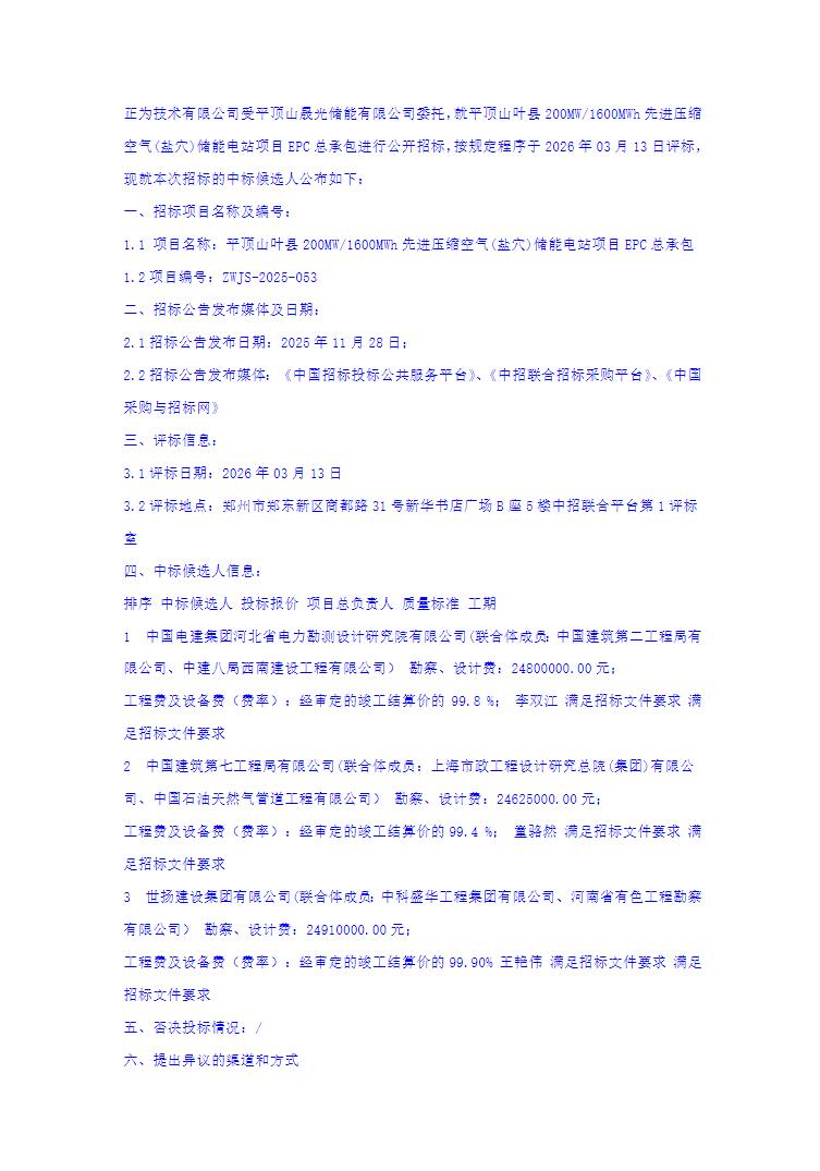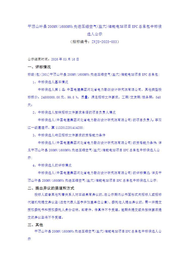 3月14日,河南平顶山叶县200MW/1600MWh先进压缩空气(盐穴)储能电站项目EPC总承包中标候选人公示。