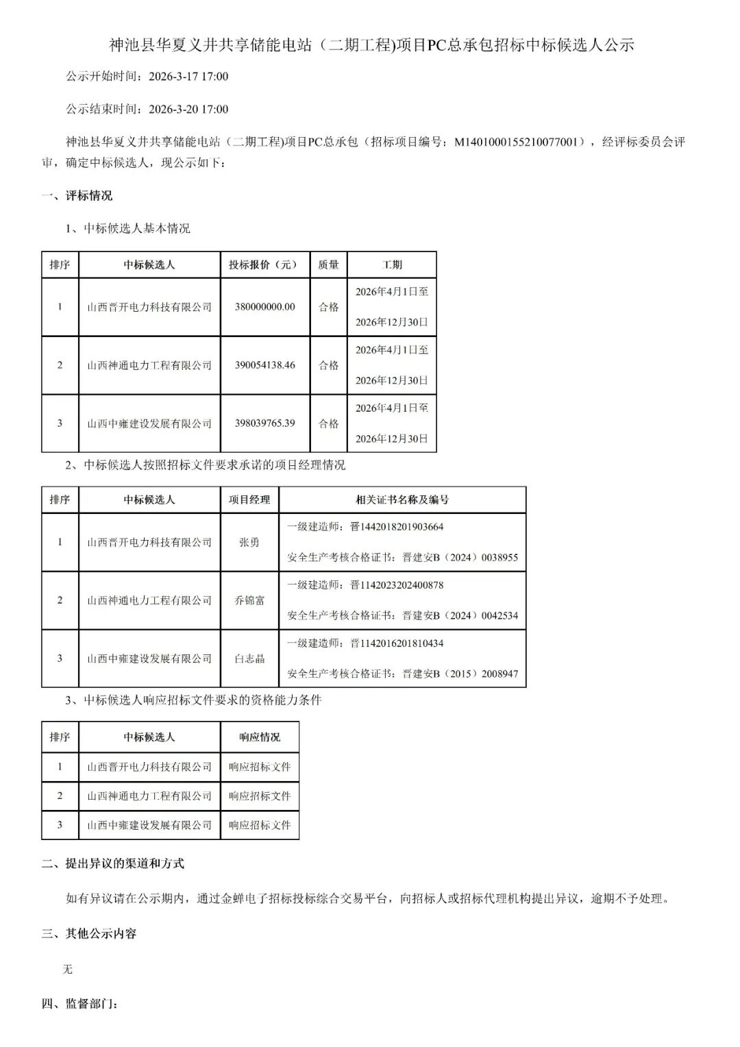 第一中标候选人为山西晋开电力科技有限公司,投标报价为380000000元,折合单价0.95元/Wh;第二中标候选人为山西神通电力工程有限公司,投标报价为390054138.46元,折合单价0.9751元/Wh;第三中标候选人为山西中雍建设发展有限公司,投标报价为398039765.39元,折合单价0.9951元/Wh。