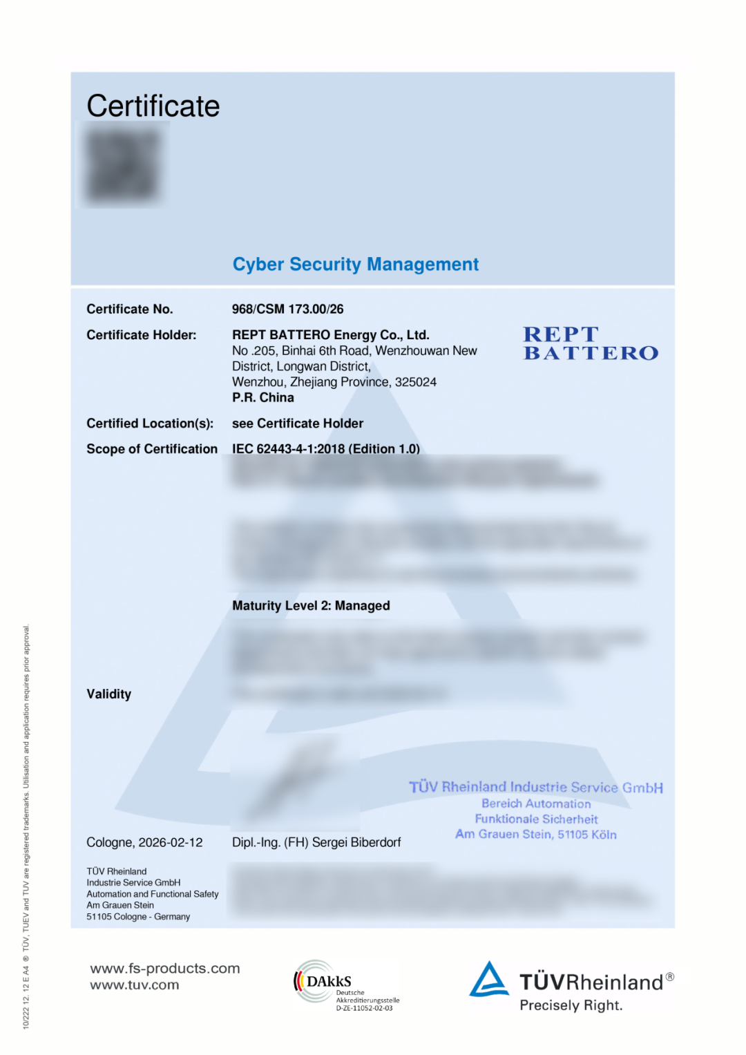 随着电池储能系统和电动汽车的普及,电池管理系统作为核心控制单元,其网络安全风险日益受到关注。一旦遭受网络攻击,可能导致电池运行异常、数据泄露甚至引发安全事故。瑞浦兰钧通过IEC 62443-4-1认证,旨在从产品开发源头构建安全防线,满足国际市场对电池产品网络安全的合规要求,特别是欧美市场对储能及动力电池日益严格的准入门槛。这不仅体现了公司对产品全生命周期安全质量的重视,也是公司为应对全球能源转型中数字化、智能化所带来的新型风险的战略举措。