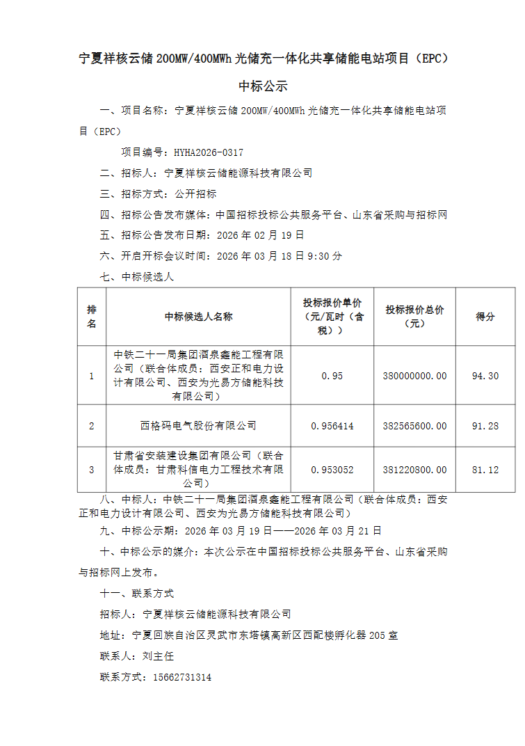 公告显示,第一中标候选人为中铁二十一局集团酒泉鑫能工程有限公司(联合体成员:西安正和电力设计有限公司、西安为光易方储能科技有限公司),投标报价为380000000元,折合单价0.95元/Wh;