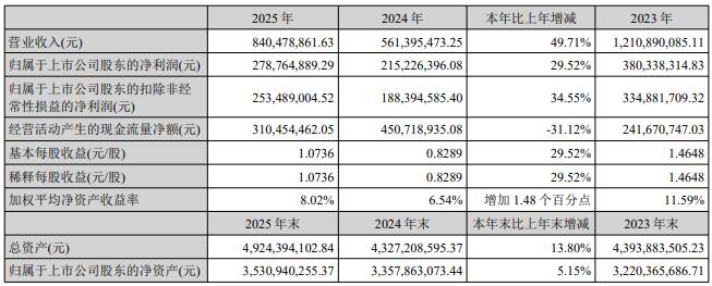 3月23日,融捷股份发布2025年年度报告。报告期内,公司实现营业总收入8.40亿元,同比增加49.71%;实现归属于上市公司股东的净利润2.79亿元,同比增加29.52%。报告期末,公司总资产49.24亿元,相比期初增加了13.80%;归属于上市公司股东的净资产35.31亿元,相比期初增加了5.15%。公司业绩增长的主要原因是本报告期锂精矿产品产销量大幅增加,以及联营企业成都融捷锂业净利润大幅增加,致使公司营业收入和利润同比增加。公司业绩变化总体符合新能源锂电池行业发展趋势。