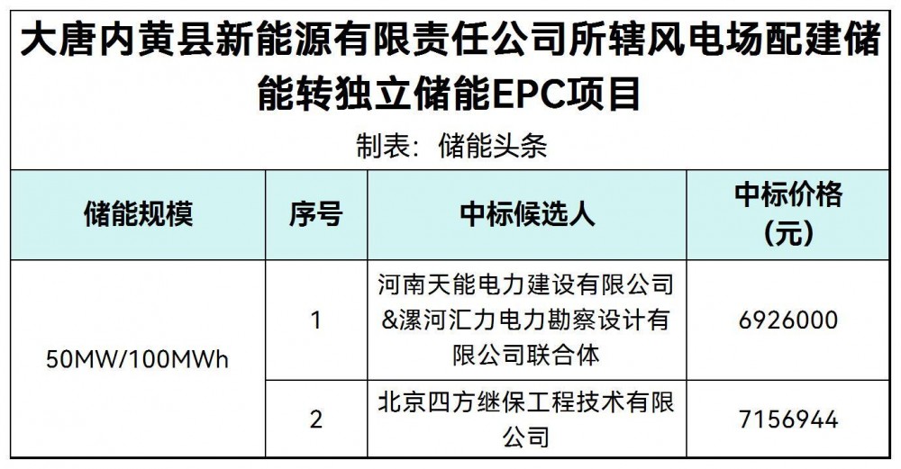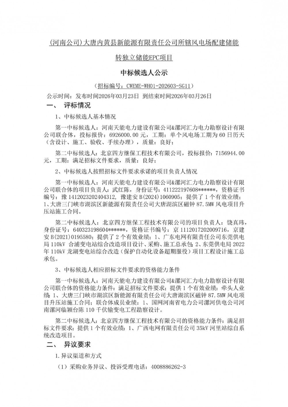 3月23日,大唐内黄县新能源有限责任公司所辖风电场配建储能转独立储能EPC项目中标候选人公示。