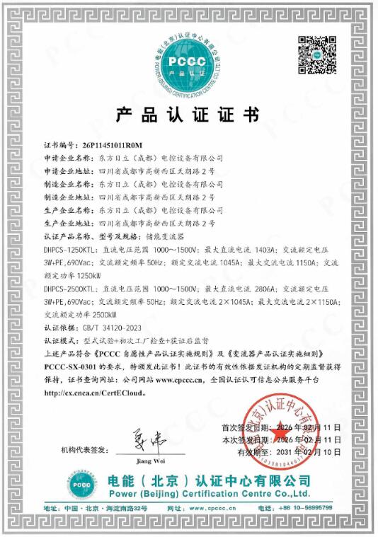 近日,东方日立自主研发的储能变流器产品顺利通过电能(北京)认证中心有限公司(PCCC)的严格审核,正式获得PCCC自愿性产品认证证书,标志着东方日立储能核心产品的技术水平与综合品质再上新台阶,是国家级机构对东方日立技术创新能力的高度认可。