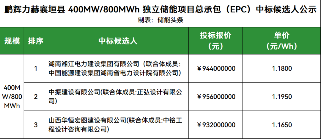 第1中标候选人为湖南湘江电力建设集团有限公司(联合体成员:中国能源建设集团湖南省电力设计院有限公司)投标报价944000000元,单价为1.18元/Wh。