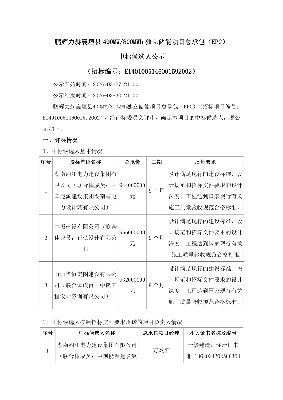 第2中标候选人为中振建设有限公司(联合体成员:正弘设计有限公司)投标报价956000000元,单价为1.195元/Wh。