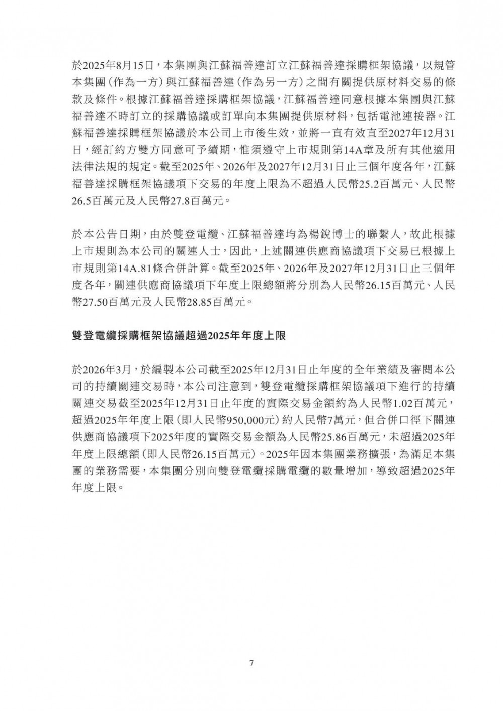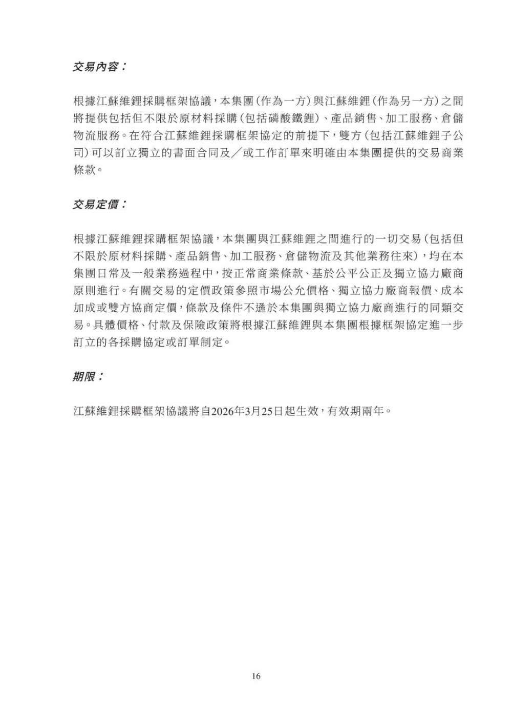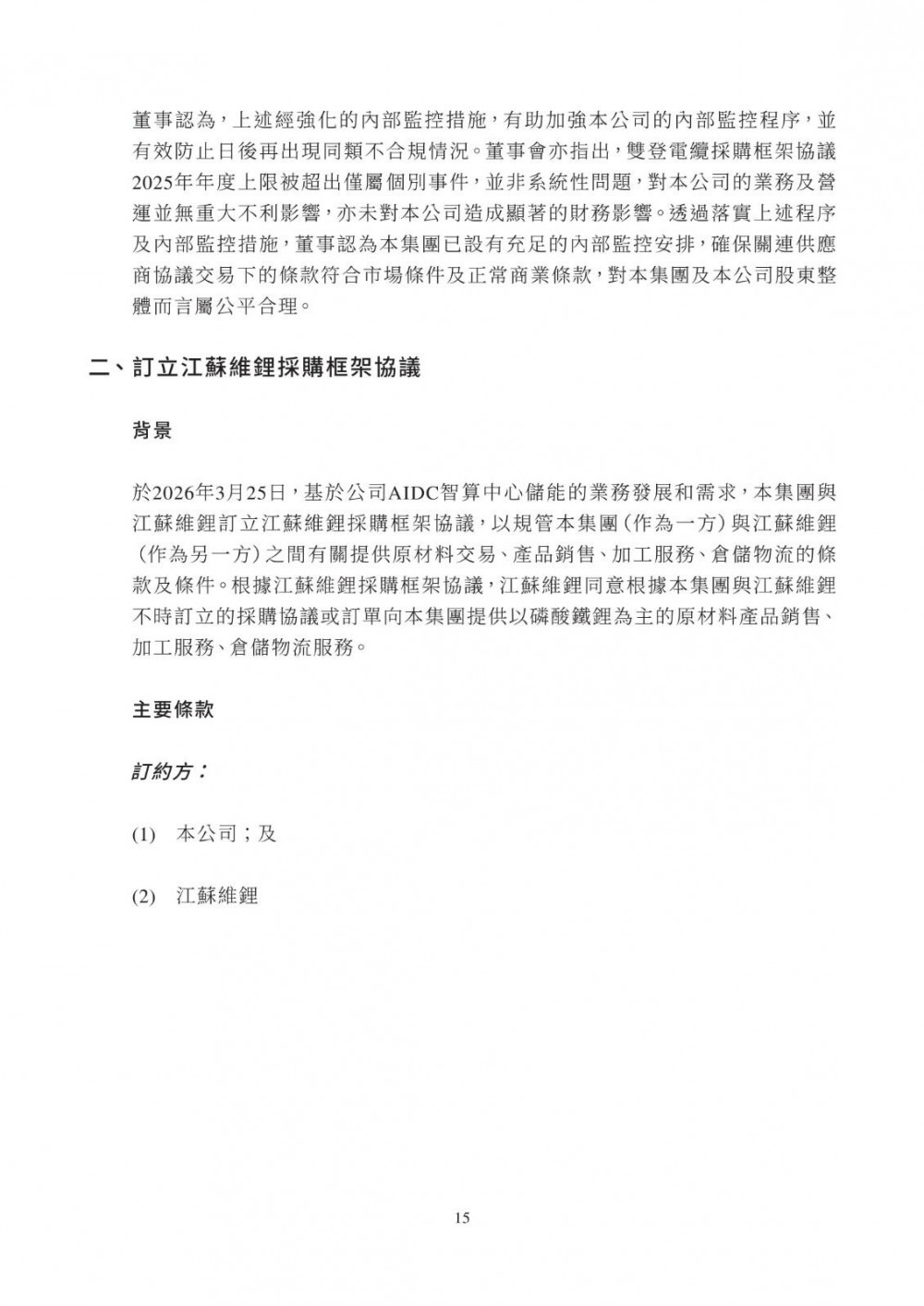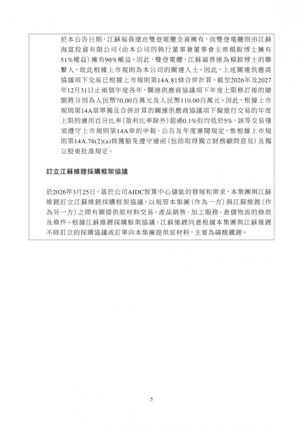 3月25日,双登股份发布公告称,公司于2026年3月25日与江苏维锂签订《江苏维锂采购框架协议》,协议自签署日起生效,有效期两年。合作内容包括磷酸铁锂等原材料采购、产品销售、加工服务及仓储物流服务;合作范围覆盖公司日常生产经营中持续采购需求,依托独立招标程序及市场化定价机制(参照市场公允价格、独立第三方报价、成本加成或双方协商),确保交易条款不逊于与独立第三方同类交易。该交易属持续关连交易,年度上限适用百分比率介于0.1%至5%之间,获豁免刊发通函及独立股东批准,仅需履行申报、公告及年度审阅义务。