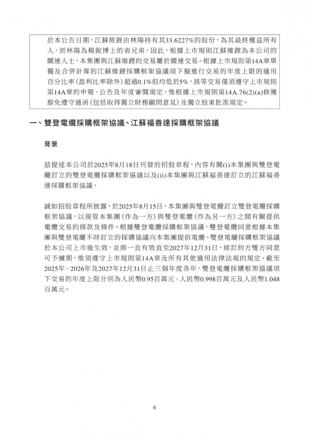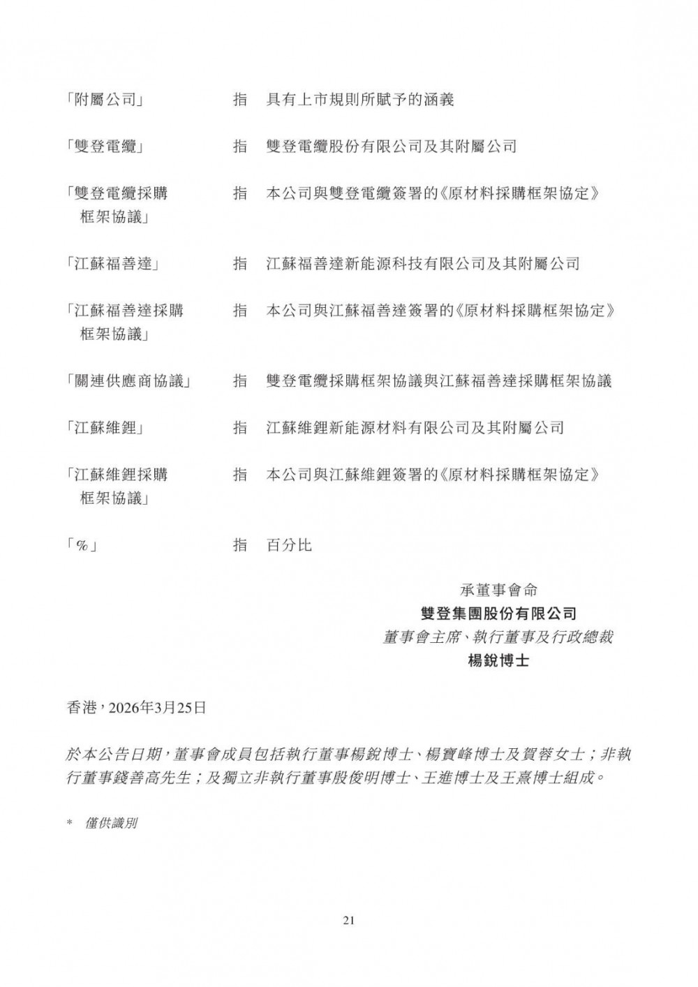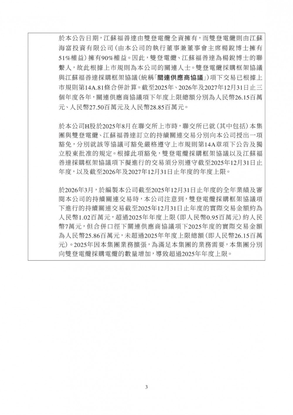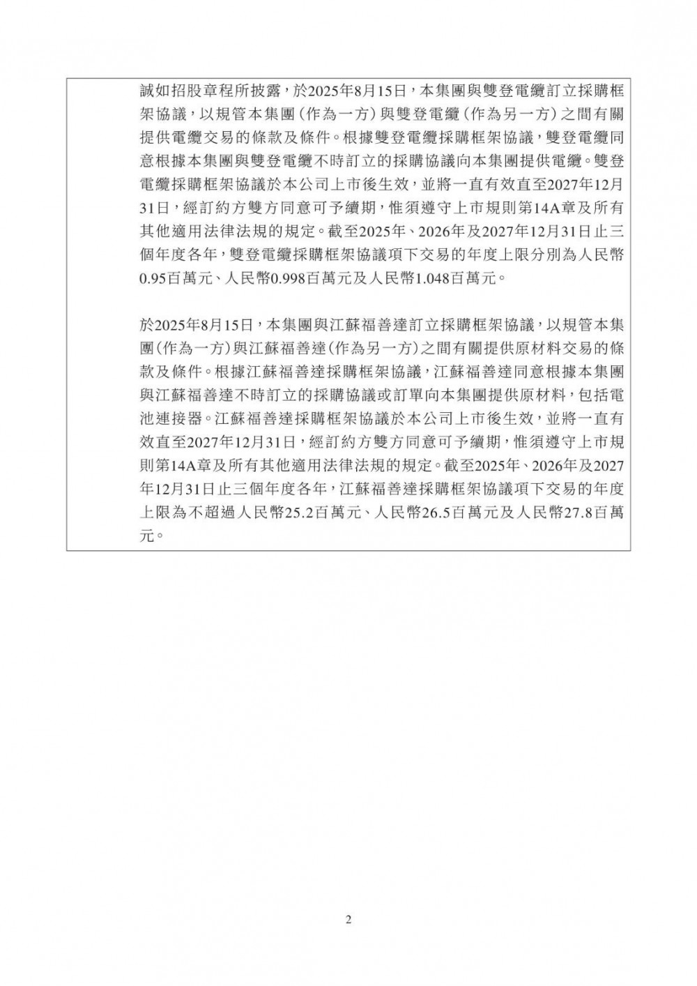 3月25日,双登股份发布公告称,公司于2026年3月25日与江苏维锂签订《江苏维锂采购框架协议》,协议自签署日起生效,有效期两年。合作内容包括磷酸铁锂等原材料采购、产品销售、加工服务及仓储物流服务;合作范围覆盖公司日常生产经营中持续采购需求,依托独立招标程序及市场化定价机制(参照市场公允价格、独立第三方报价、成本加成或双方协商),确保交易条款不逊于与独立第三方同类交易。该交易属持续关连交易,年度上限适用百分比率介于0.1%至5%之间,获豁免刊发通函及独立股东批准,仅需履行申报、公告及年度审阅义务。