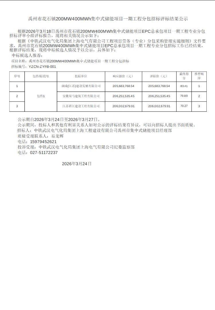 3月26日,禹州市花石镇200MW400MWh集中式储能项目一期工程分包招标中标候选人公示。