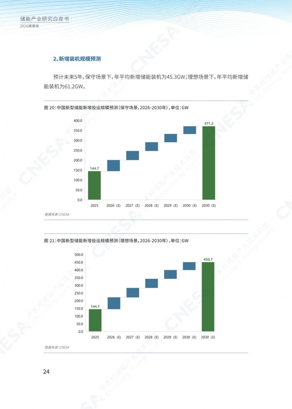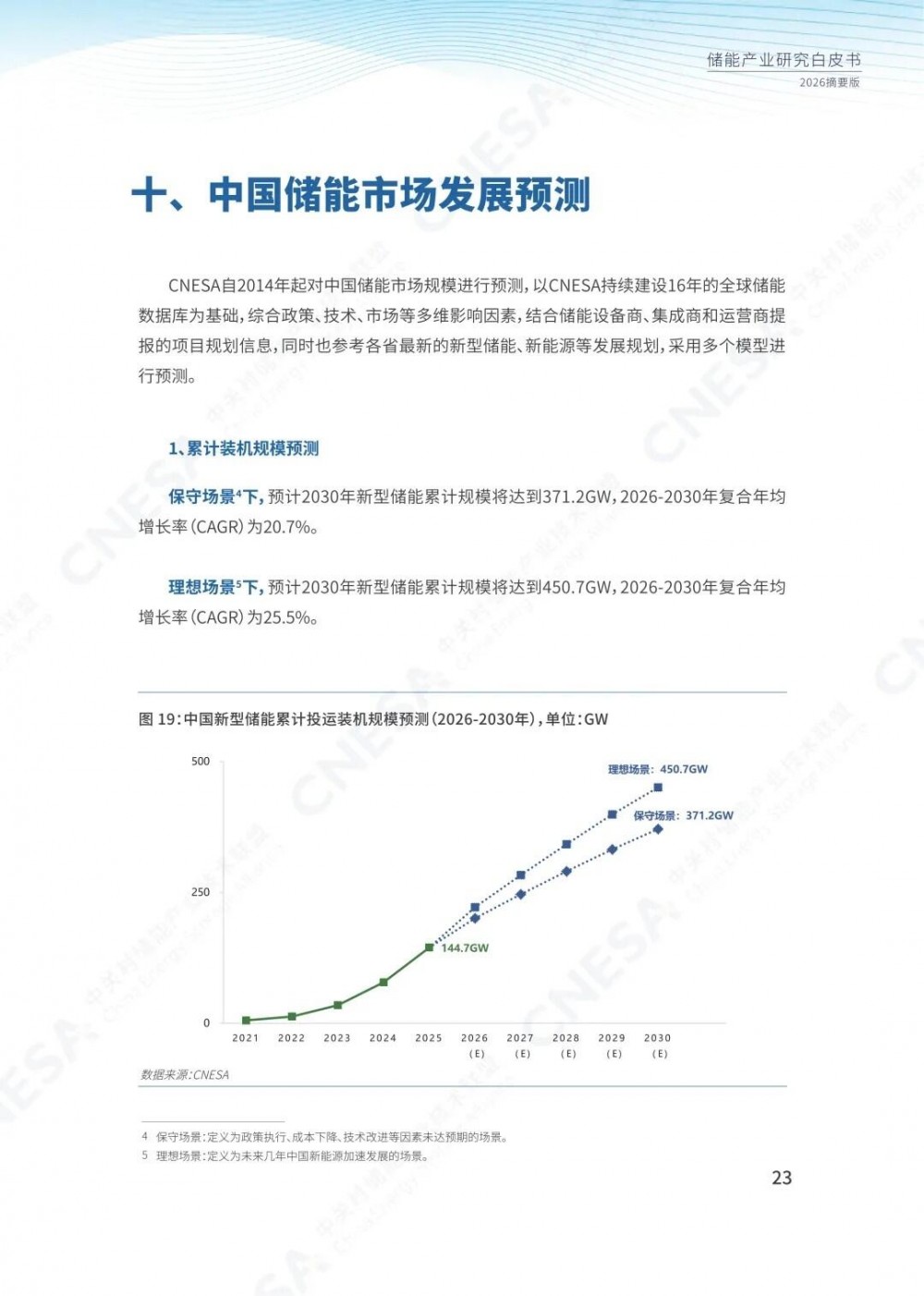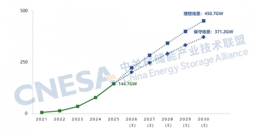 理想场景下,预计2030年新型储能累计规模将达到450.7GW,2026-2030年复合年均增长率(CAGR)为25.5%。