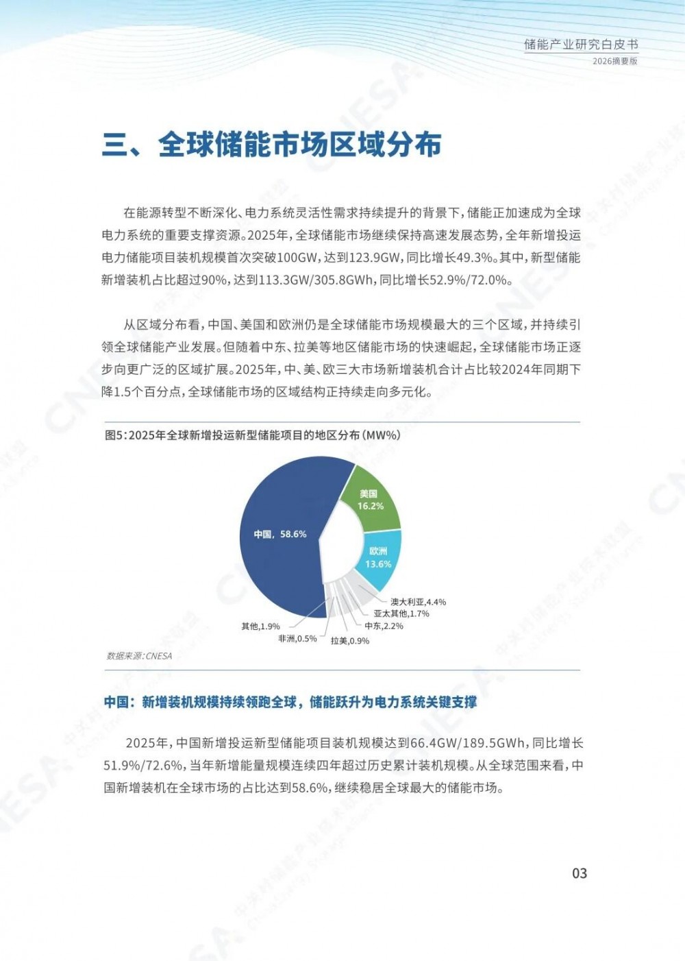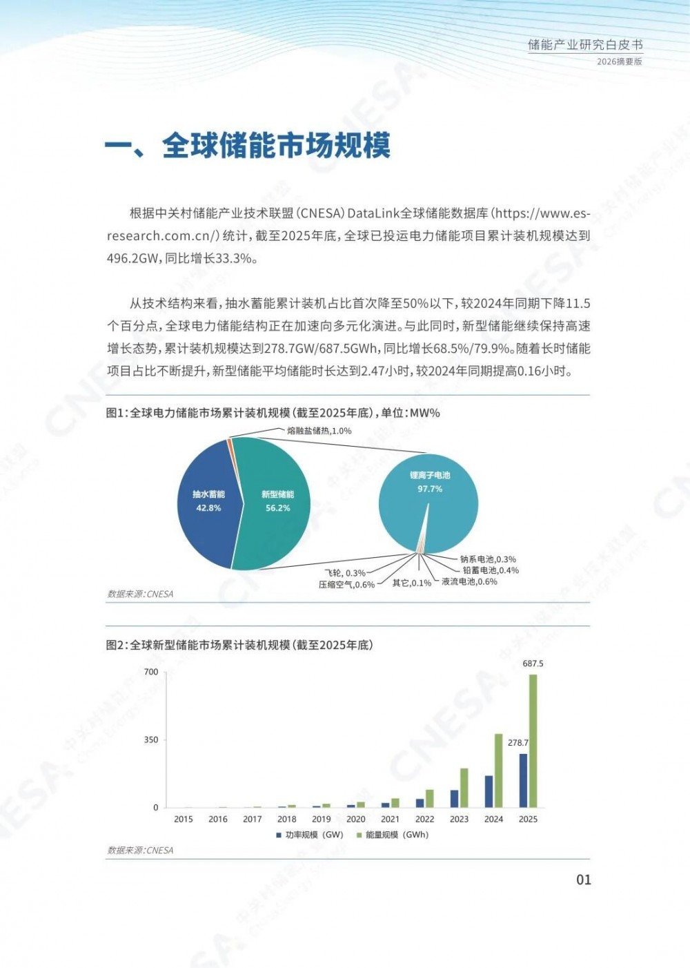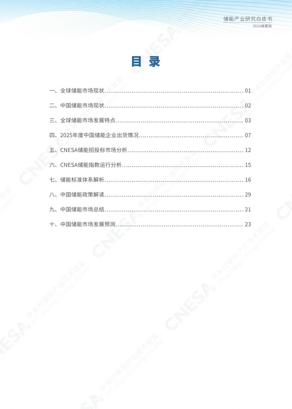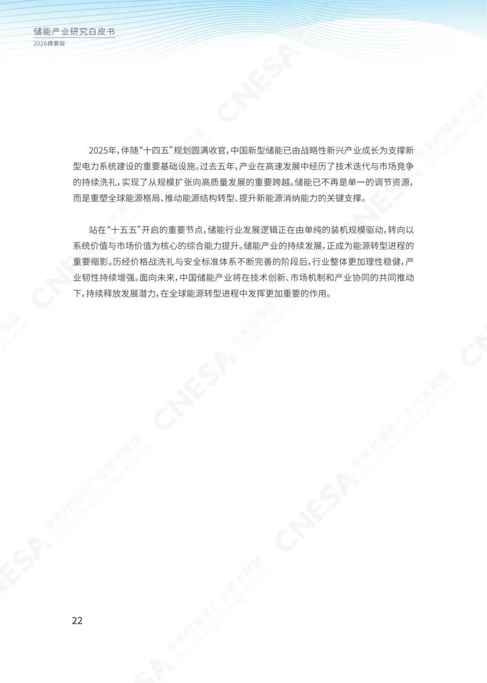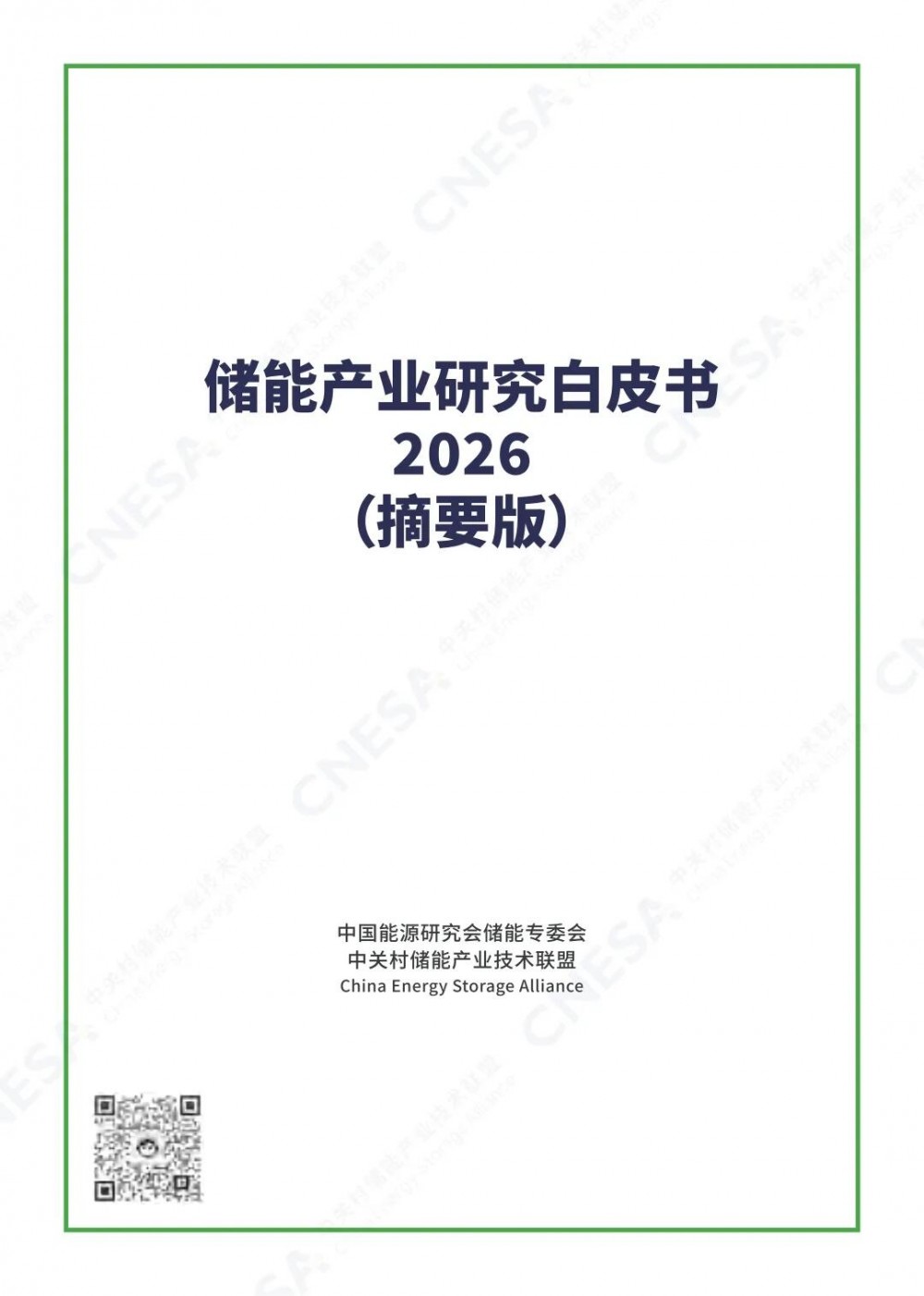 《储能产业研究白皮书2026》系统梳理并深入总结了全球主要国家和地区的市场规模、招中标市场及价格、企业出货与装机、典型企业订单与产品、政策与电力市场规则、储能安全与标准、投融资进展等多个维度,并结合当前产业格局与前沿技术趋势,对未来市场机遇与发展规模作出了前瞻性研判。