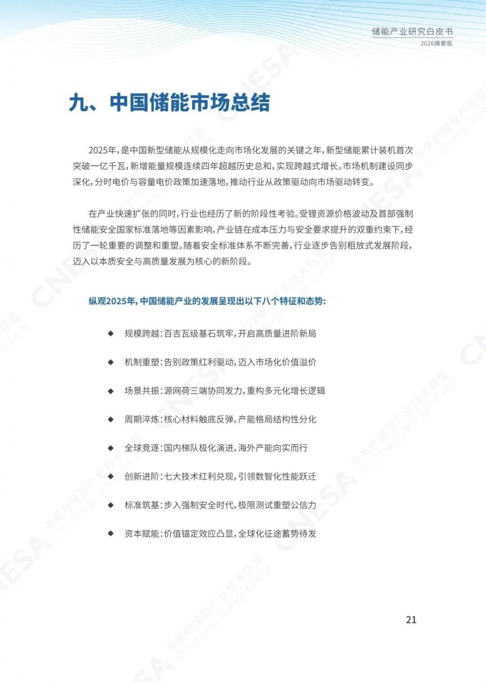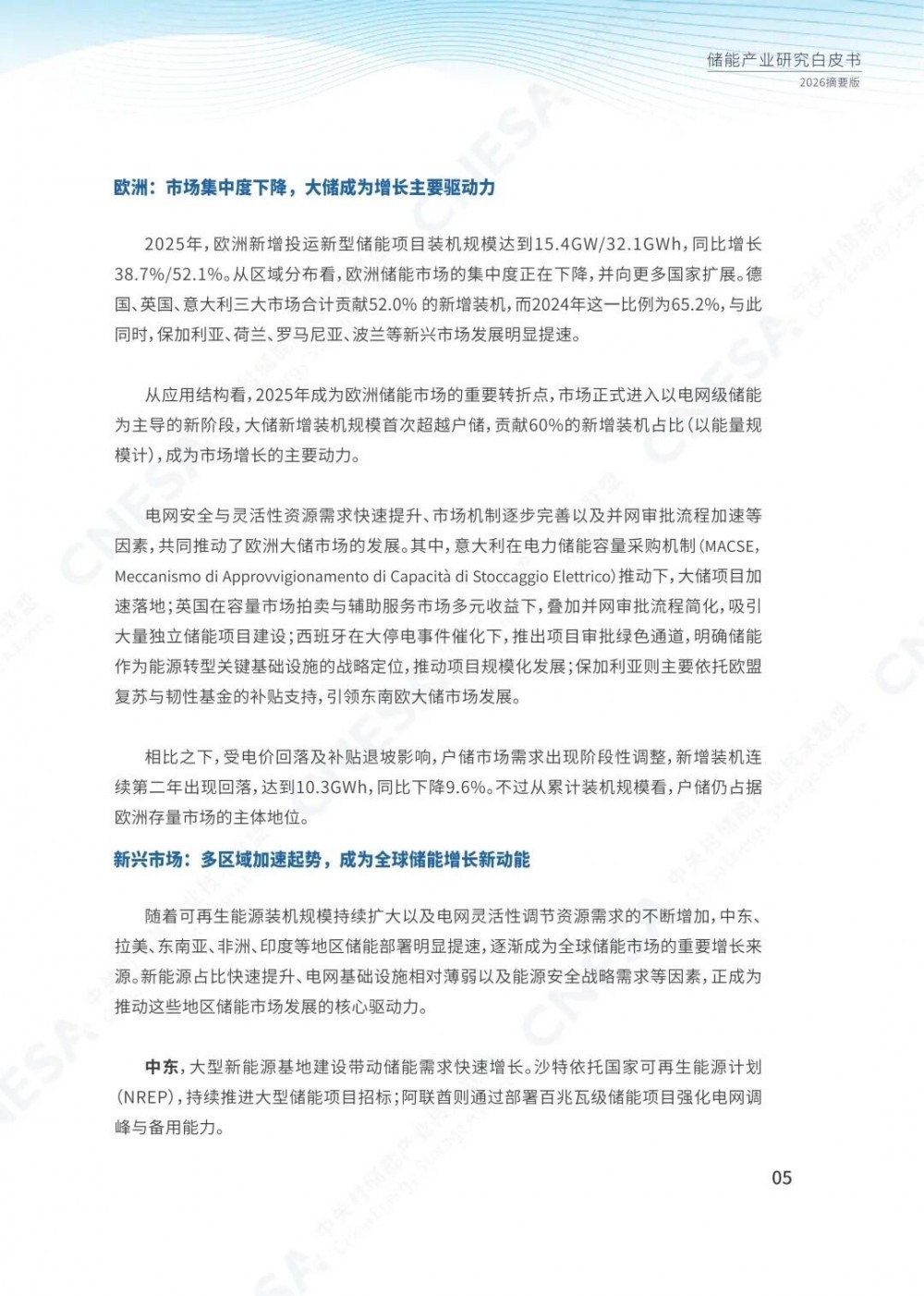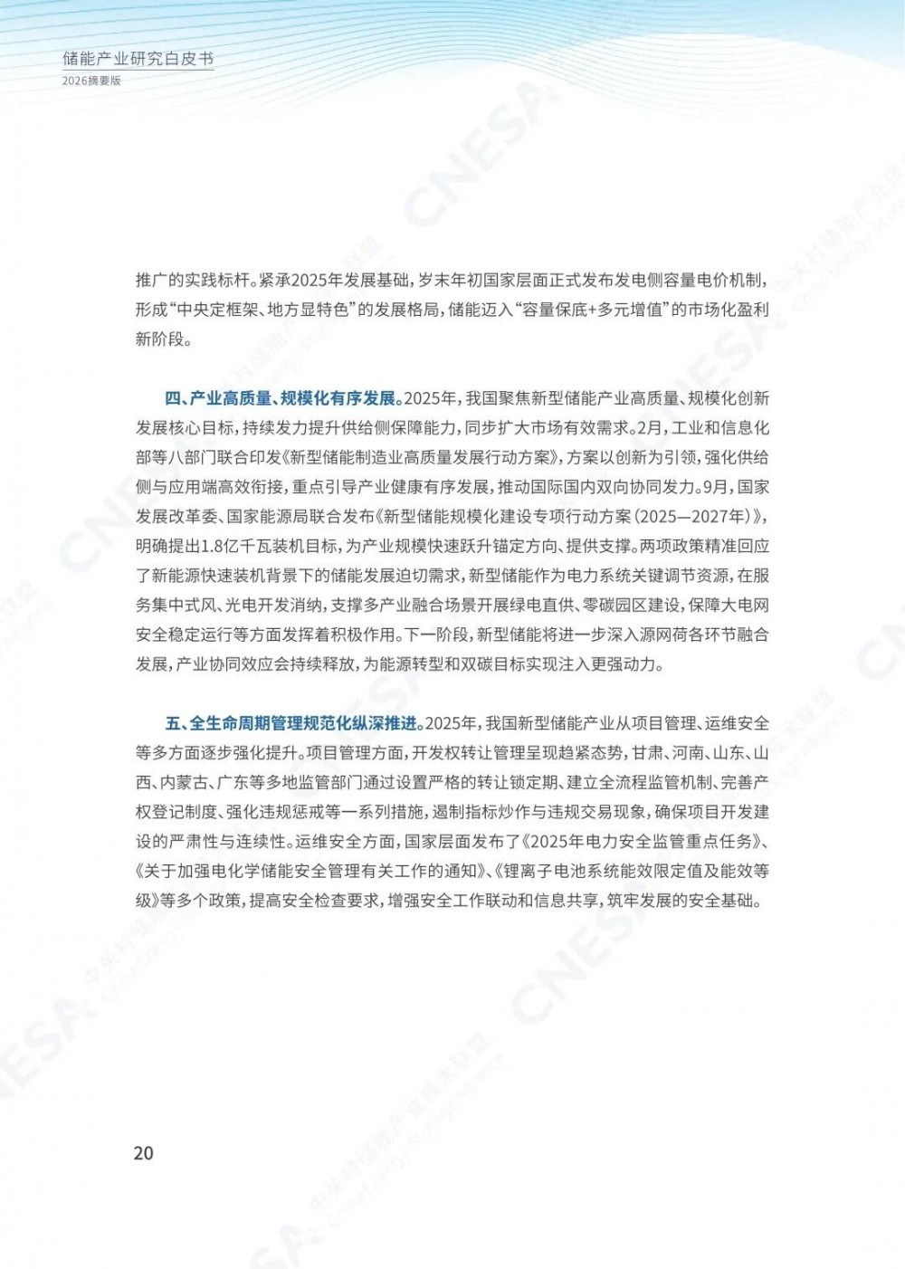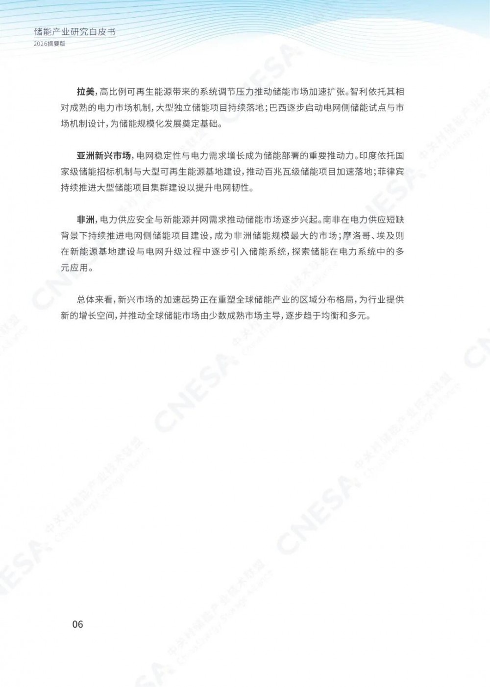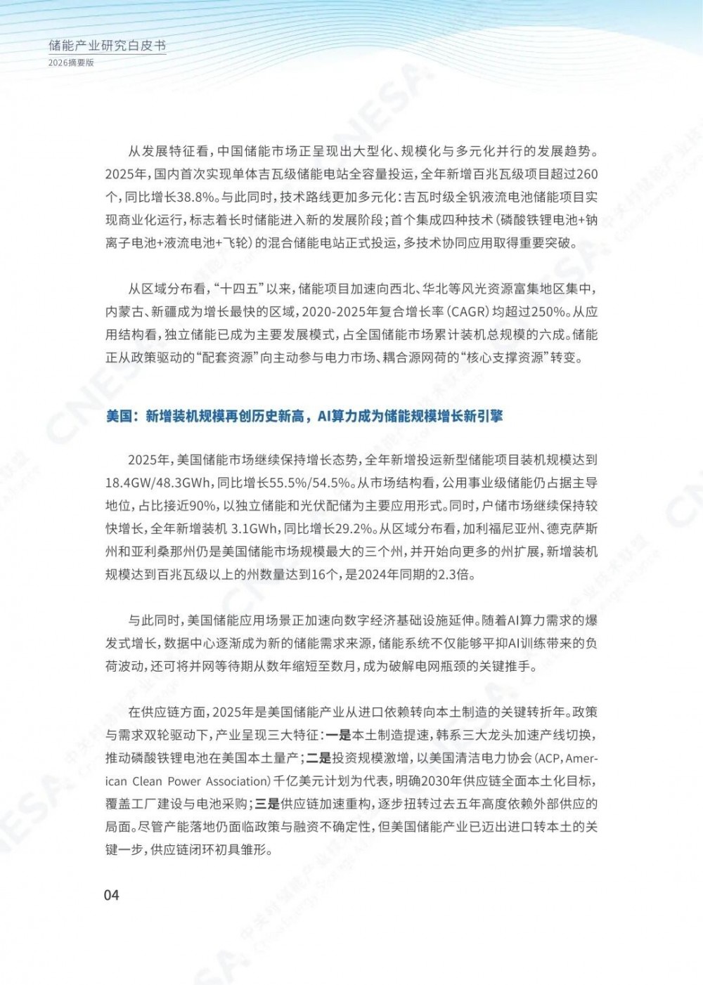 《储能产业研究白皮书2026》系统梳理并深入总结了全球主要国家和地区的市场规模、招中标市场及价格、企业出货与装机、典型企业订单与产品、政策与电力市场规则、储能安全与标准、投融资进展等多个维度,并结合当前产业格局与前沿技术趋势,对未来市场机遇与发展规模作出了前瞻性研判。