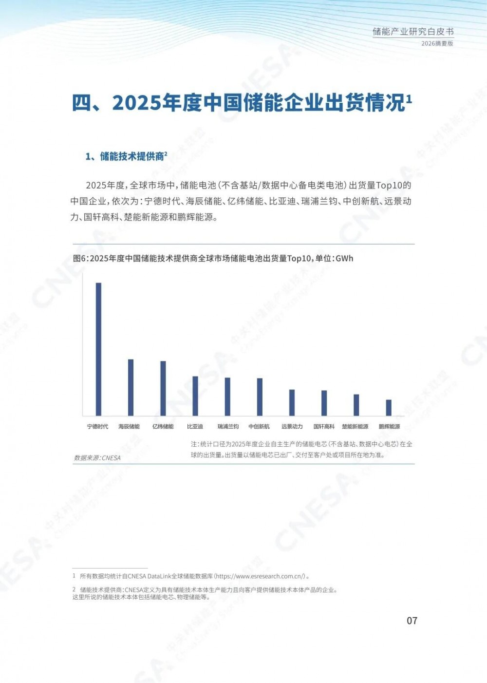 1.CNESA定义储能技术提供商为具有储能技术本体生产能力且向客户提供储能技术本体产品的企业。这里所说的储能技术本体包括储能电芯、物理储能等。统计口径为2025年度企业自主生产的储能电芯(不含基站、数据中心电芯)在全球的出货量。出货量以储能电芯已出厂、交付至客户处或项目所在地为准。