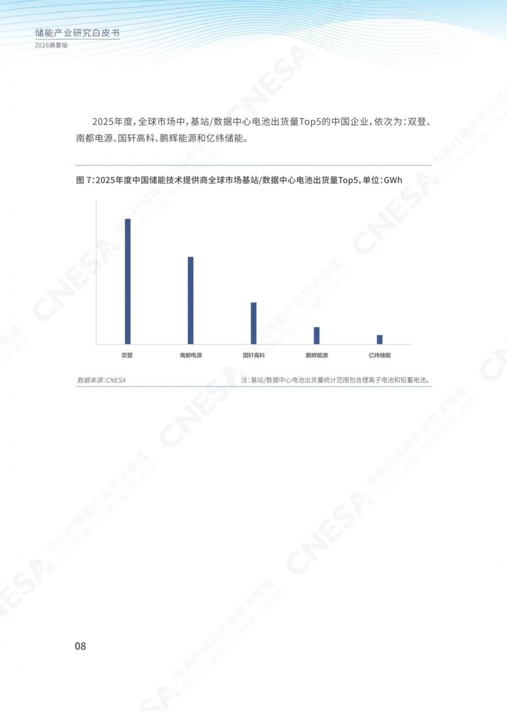 2025年度,全球市场中,基站/数据中心电池出货量Top5的中国企业,依次为:双登、南都电源、国轩高科、鹏辉能源和亿纬储能。