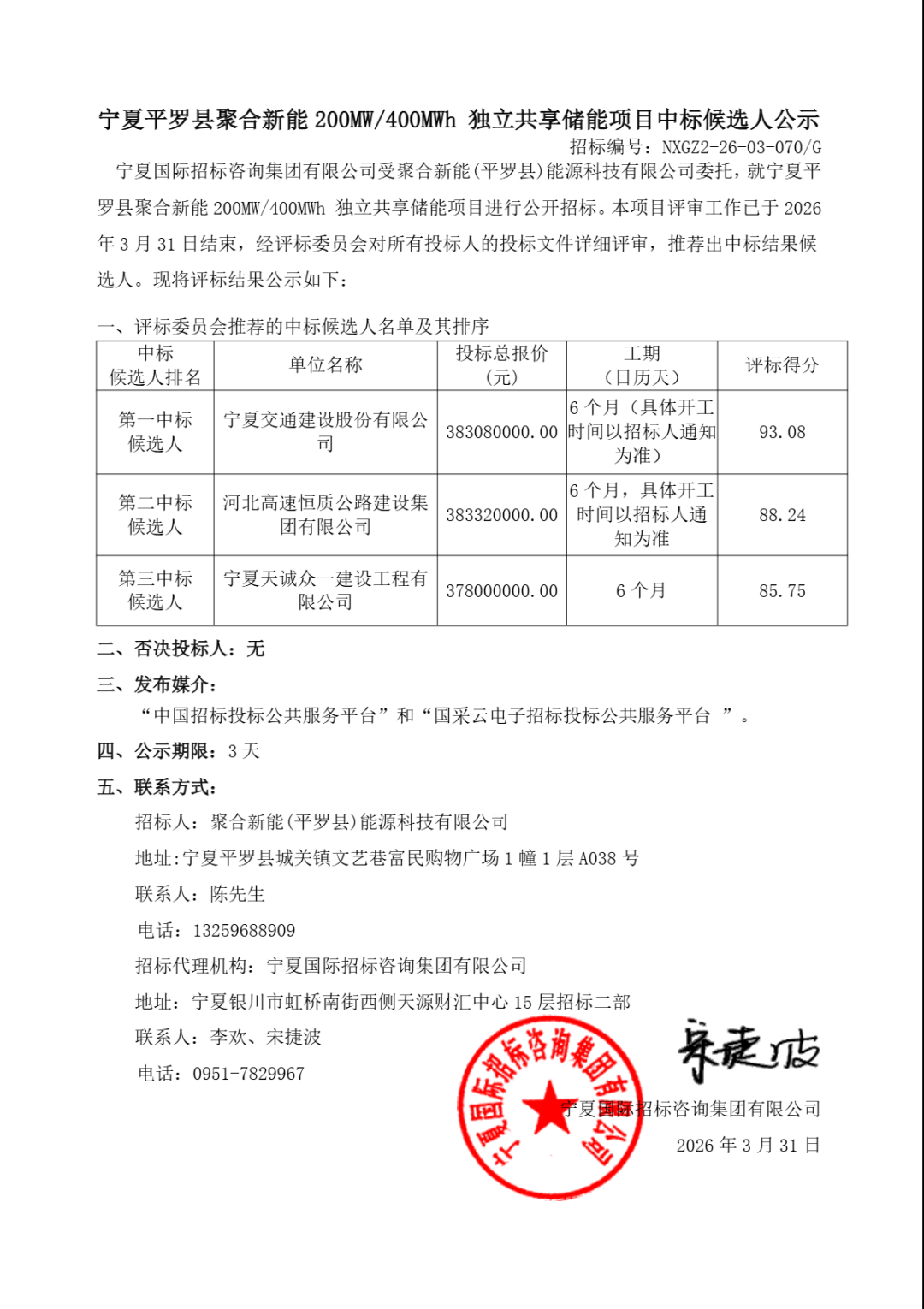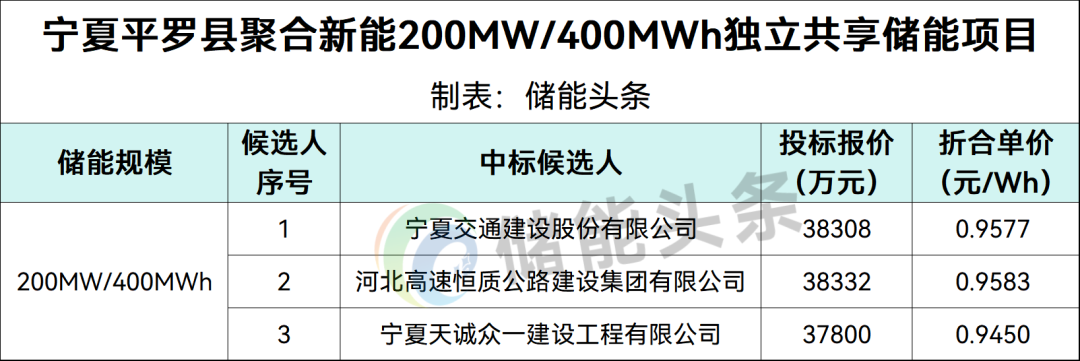 第一中标候选人为宁夏交通建设股份有限公司,投标报价38308万元,折合单价0.9577元/Wh;第二中标候选人为河北高速恒质公路建设集团有限公司,投标报价38332万元,折合单价0.9583元/Wh;第三中标候选人为宁夏天诚众一建设工程有限公司,投标报价37800万元,折合单价0.945元/Wh。发