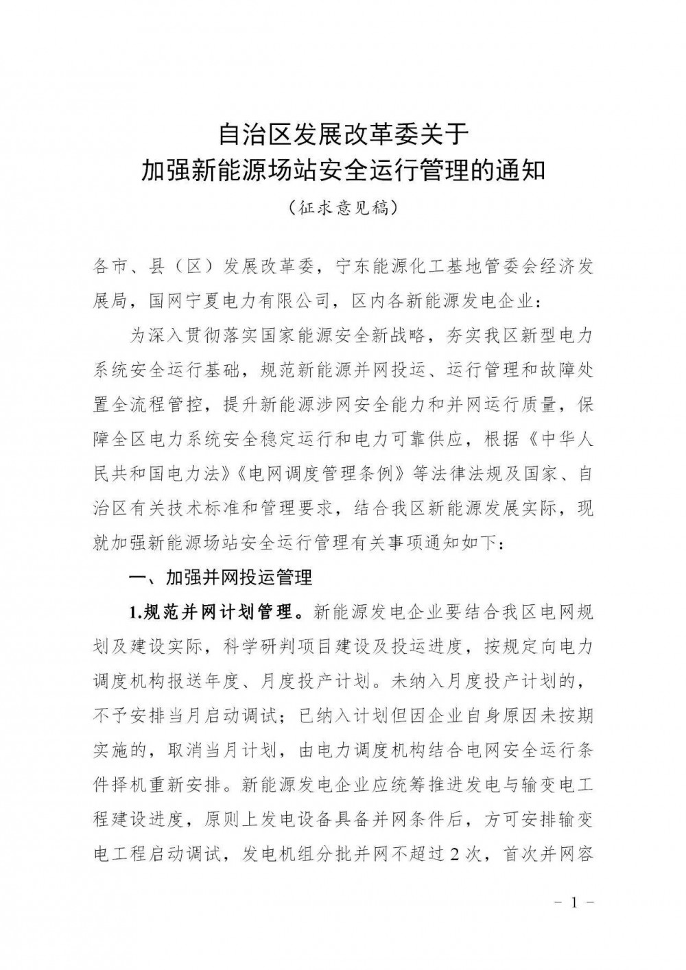 新能源发电企业要结合宁夏回族自治区电网规划及建设实际,科学研判项目建设及投运进度,按规定向电力调度机构报送年度、月度投产计划。未纳入月度投产计划的,不予安排当月启动调试;已纳入计划但因企业自身原因未按期实施的,取消当月计划,由电力调度机构结合电网安全运行条件择机重新安排。新能源发电企业应统筹推进发电与输变电工程建设进度,原则上发电设备具备并网条件后,方可安排输变电工程启动调试,发电机组分批并网不超过2次,首次并网容量应不小于总额定容量30%。