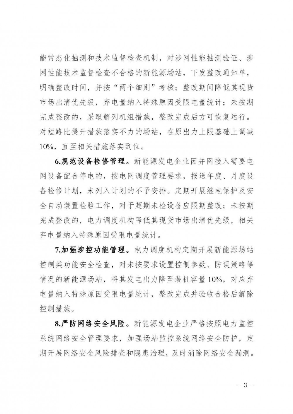 加强涉控功能管理。电力调度机构定期开展新能源场站控制类功能安全检查,对未按要求设置控制参数、防误策略等情况的新能源场站,将其发电出力降至装机容量10%,对应弃电量纳入特殊原因受限电量统计,整改完成并验收合格后解除控制措施。