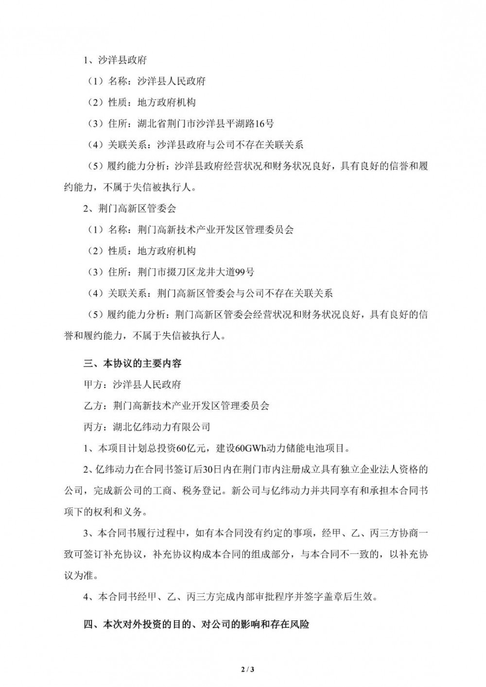 近日,亿纬锂能发布公告称,公司拟与惠州仲恺高新技术产业开发区管理委员会就公司在仲恺高新区管委会范围内投资建设“亿纬锂能60GWh储能(动力)电池生产制造项目”相关事宜签订《投资合作协议书》。本项目投资总额约60亿元,用地面积约500亩(以实际招拍挂取得土地为准),建设60GWh储能(动力)电池生产基地项目。董事会授权公司管理层办理本项目的所有后续事项,并签署与本项目相关的手续及文件。