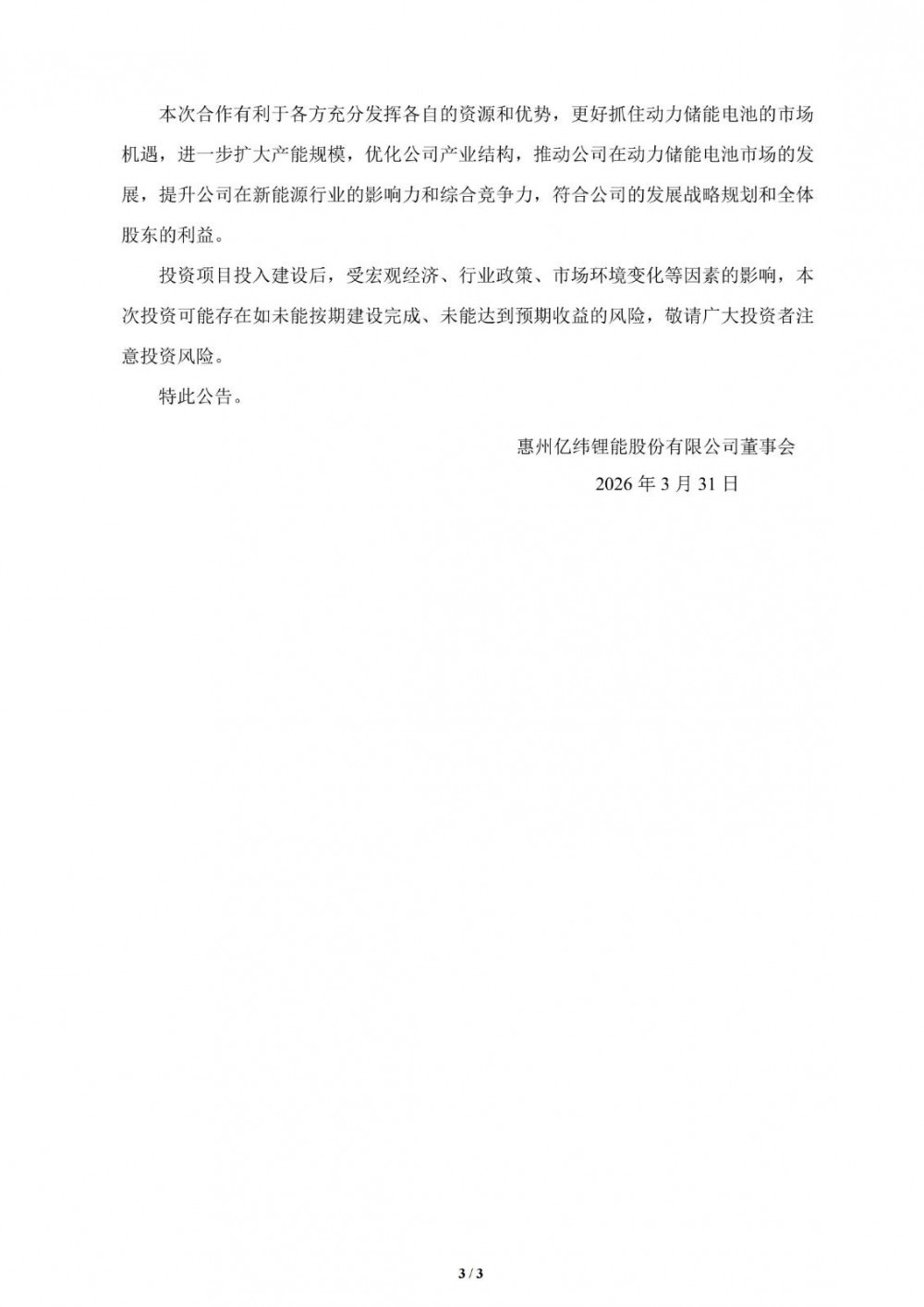 亿纬锂能表示,本次合作有利于各方充分发挥各自的资源和优势,更好地抓住储能动力电池的市场机遇,进一步扩大产能规模,优化公司产业结构,推动公司在锂离子动力电池市场的发展,提升公司在新能源行业的影响力和综合竞争力,符合公司的发展战略规划和全体股东的利益。