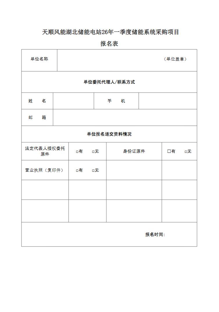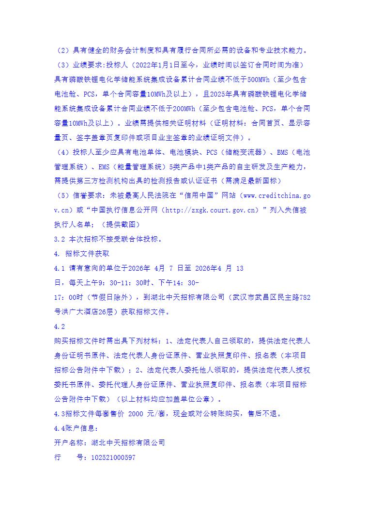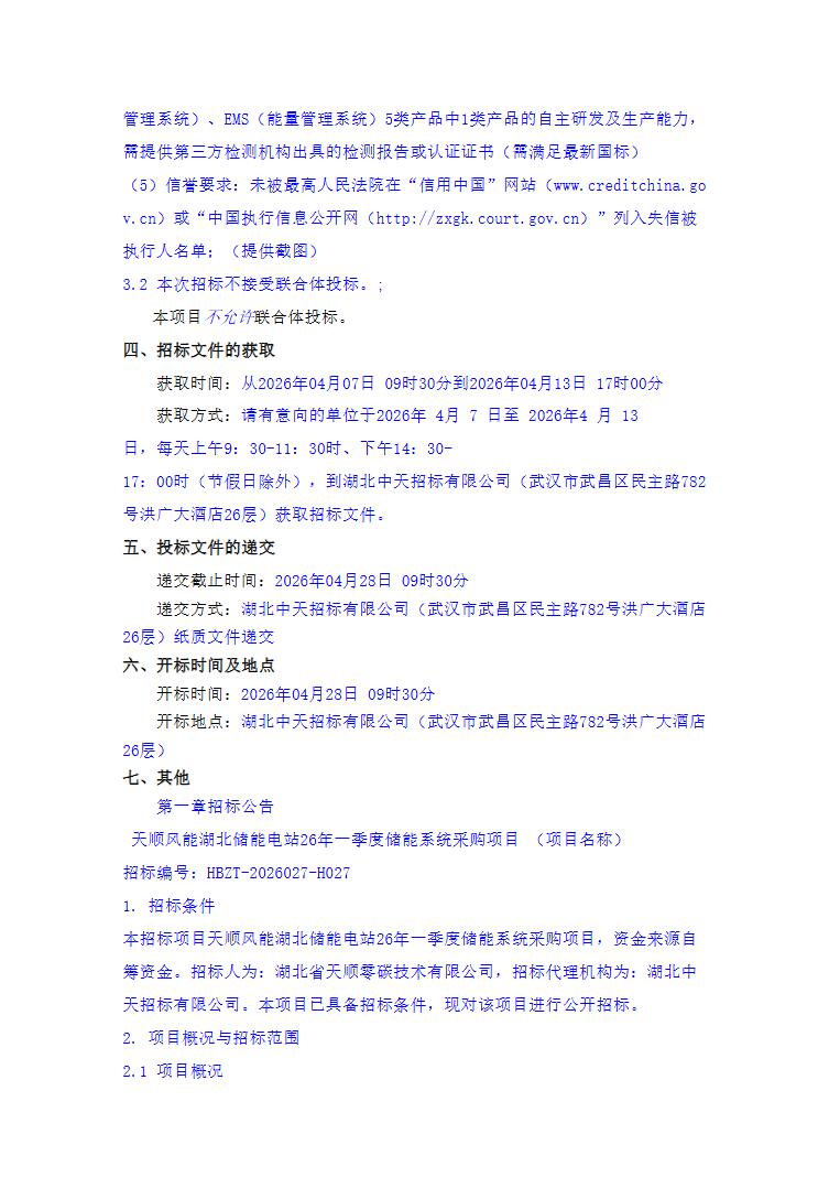 4月3日,天顺风能湖北储能电站26年一季度储能系统采购项目招标公告发布。