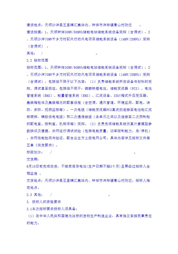 本招标项目划分为1个标段,1、天顺钟祥30MW/60MWh储能电站储能系统设备采购(含调试),2、天顺沙洋70MW千乡万村驭风行动风电项目储能系统设备(14MW/28MWh)采购(含调试),包括但不限于以下内容: