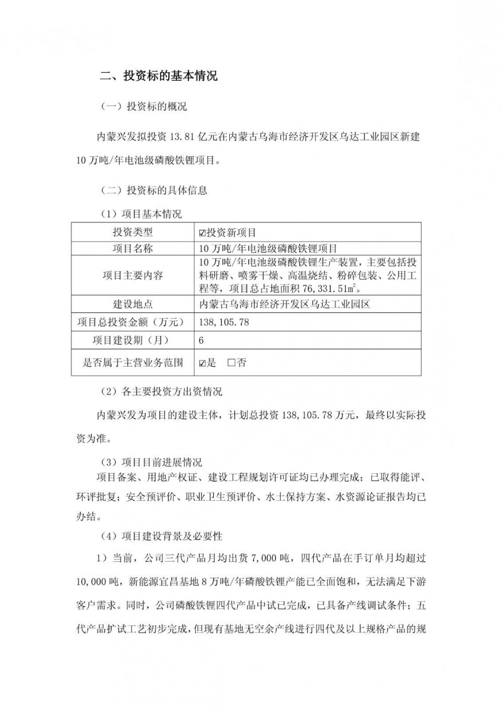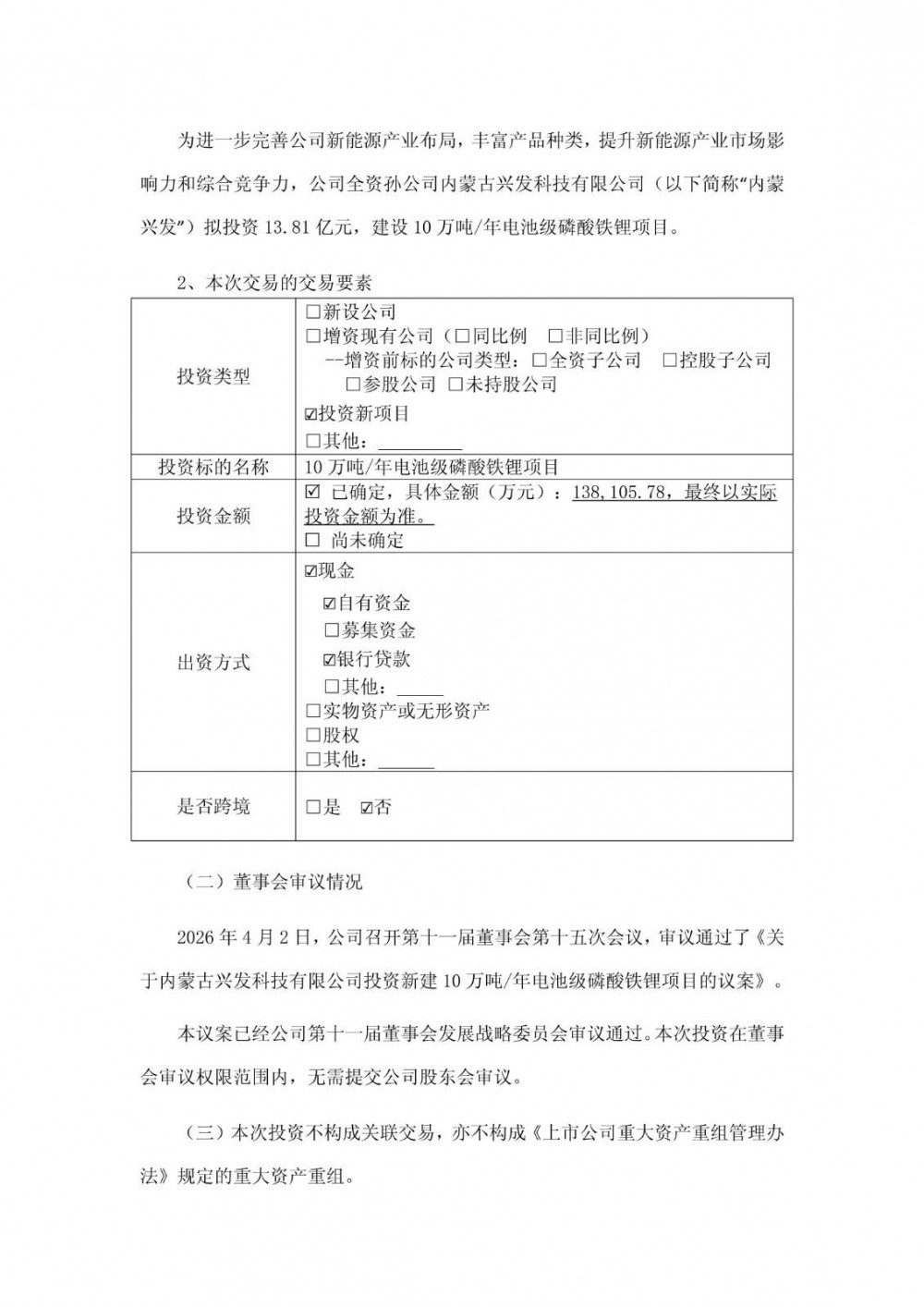 近日,兴发集团发布公告称,为进一步完善公司新能源产业布局,丰富产品种类,提升新能源产业市场影响力和综合竞争力,公司全资孙公司内蒙古兴发科技有限公司拟投资13.81亿元,建设10万吨/年电池级磷酸铁锂项目。