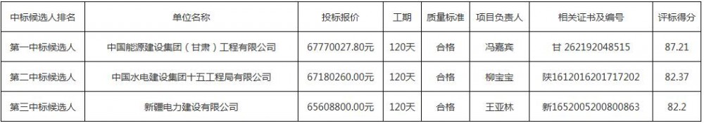第一中标候选人为中国能源建设集团(甘肃)工程有限公司,中标价格为67770027.8元,折合单价0.6777元/Wh;第二中标候选人为中国水电建设集团十五工程局有限公司,中标价格为67180260元,折合单价0.6718元/Wh;第三中标候选人为新疆电力建设有限公司,中标价格为65608800元,折合单价0.6561元/Wh。