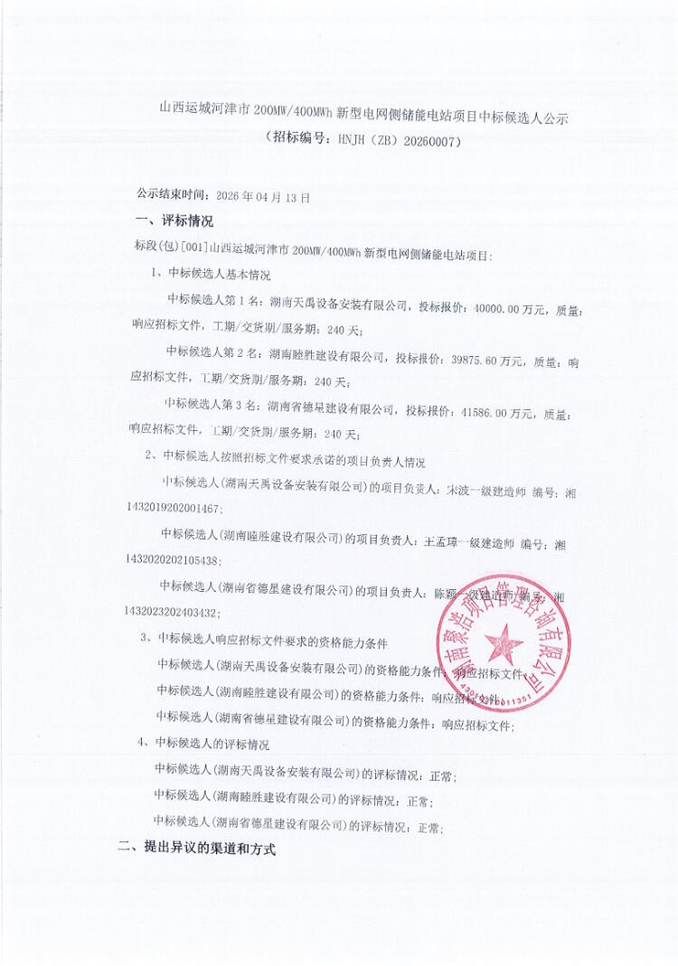 第一中标候选人为湖南天禹设备安装有限公司,中标价格为40000万元,折合单价1元/Wh;第二中标候选人为湖南睦胜建设有限公司,中标价格为39875.6万元,折合单价0.9969元/Wh;第三中标候选人为湖南省德星建设有限公司,中标价格为41586万元,折合单价1.0397元/Wh。