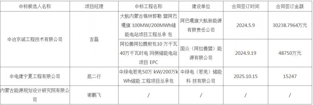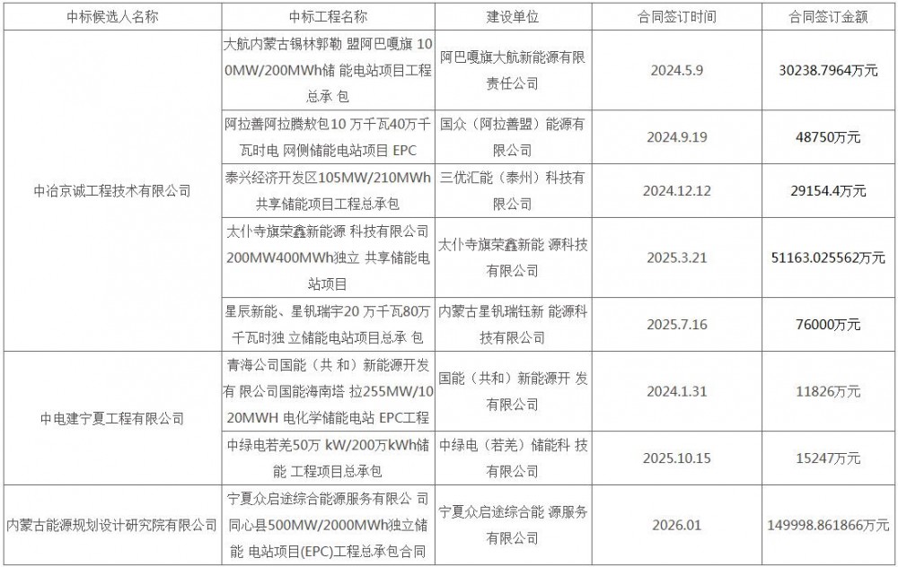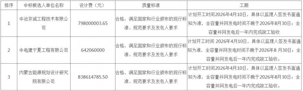 第一中标候选人为中冶京诚工程技术有限公司,中标价格为798000003.65元,折合单价1.1007元/Wh;第二中标候选人为中电建宁夏工程有限公司,中标价格为642060000元,折合单价0.8856元/Wh;第三中标候选人为内蒙古能源规划设计研究院有限公司,中标价格为838614785.5元,折合单价1.1567元/Wh。