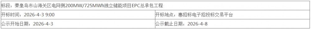 近日,秦皇岛市山海关区电网侧200MW/725MWh独立储能项目EPC总承包工程中标候选人公示。