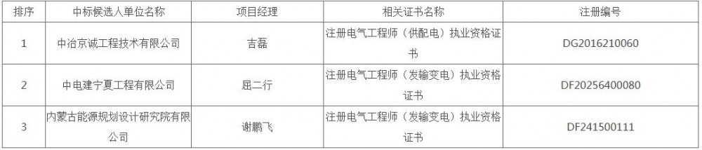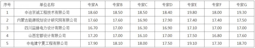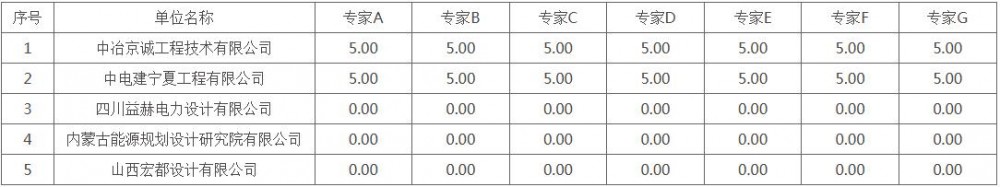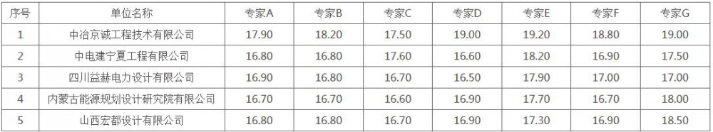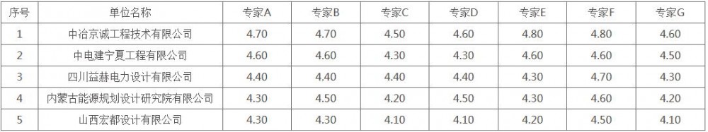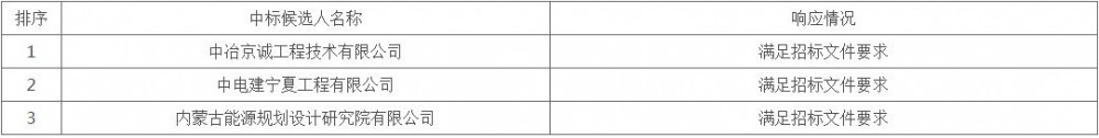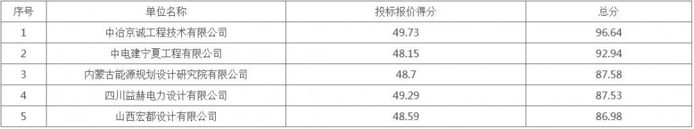 参加投标单位:(1)中冶京诚工程技术有限公司、(2)中电建宁夏工程有限公司、(3)四川益赫电力设计有限公司、(4)内蒙古能源规划设计研究院有限公司、(5)山西宏都设计有限公司。