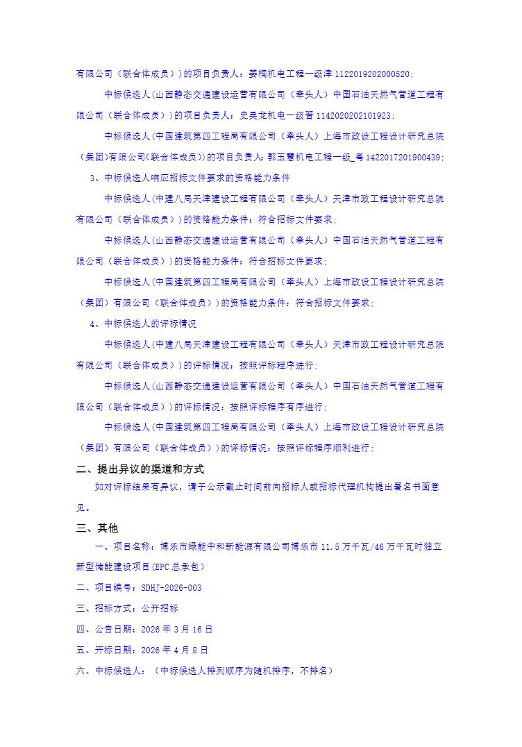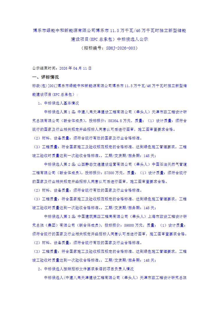 4月8日,博乐市绿能中和新能源有限公司博乐市11.5万千瓦/46万千瓦时独立新型储能建设项目(EPC总承包)中标候选人公示。
