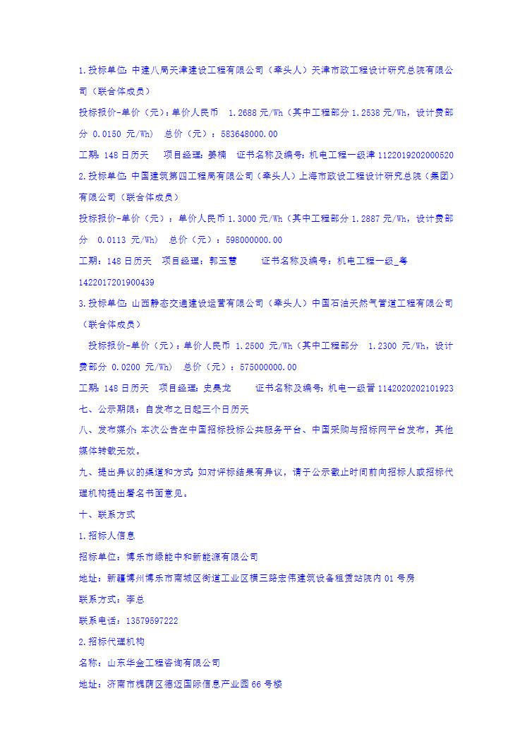 第一中标候选人为中建八局天津建设工程有限公司、天津市政工程设计研究总院有限公司联合体,中标价格为58364.8万元,折合单价1.2688元/Wh;第二中标候选人为山西静态交通建设运营有限公司、中国石油天然气管道工程有限公司联合体,中标价格为57500万元,折合单价1.25元/Wh;第三中标候选人为中国建筑第四工程局有限公司、上海市政设工程设计研究总院(集团)有限公司联合体,中标价格为59800万元,折合单价1.3元/Wh。