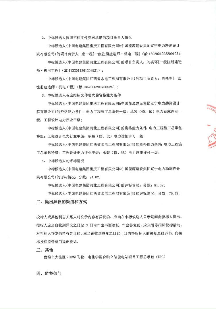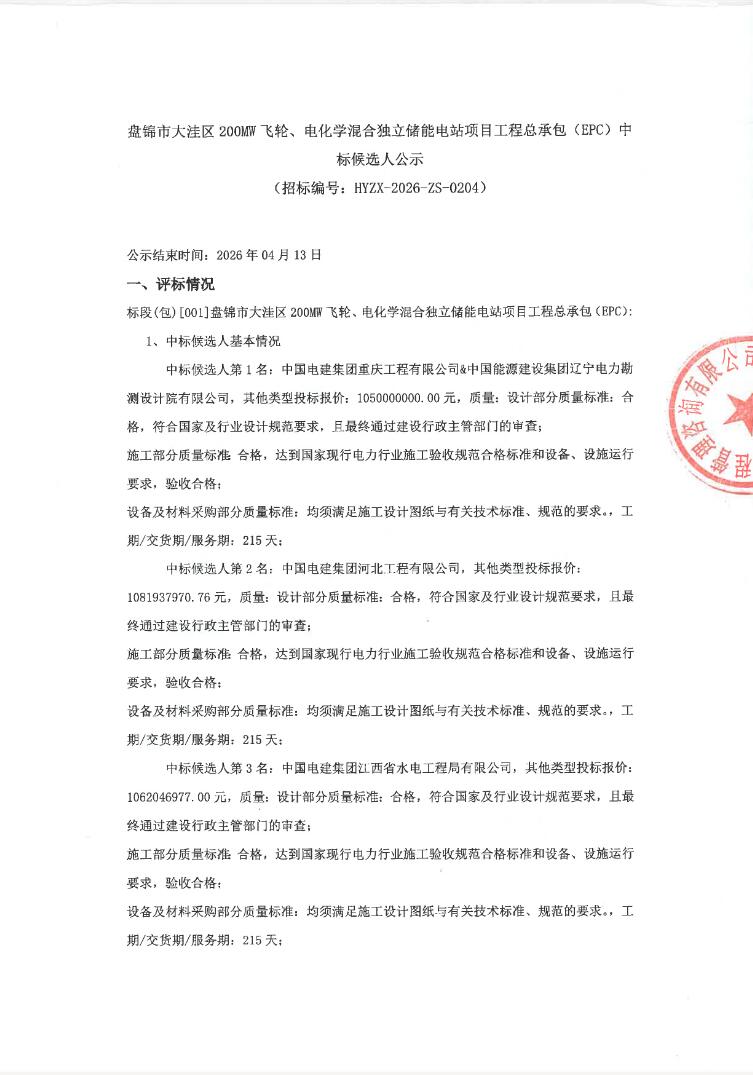4月8日,盘锦市大洼区200MW飞轮、电化学混合独立储能电站项目工程总承包(EPC)中标候选人公示。