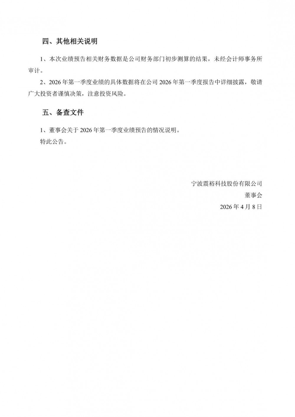 4月8日,震裕科技发布2026年第一季度业绩预告。2026年第一季度公司预计实现归母净利润2.75亿元至3.05亿元,同比增长277.43%至318.61%;扣非后净利润2.60亿元至2.90亿元,同比增长298.58%至344.57%。