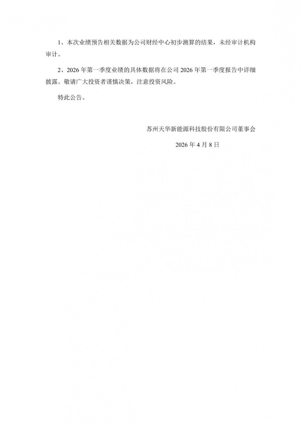 4月8日,天华新能发布2026年第一季度业绩预告。预计2026年第一季度归属于上市公司股东的净利润为9亿元—10.5亿元,比上年同期增长27517.53%—32120.45%。