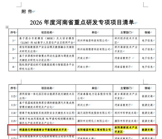 近日,2026年度河南省重点研发专项立项名单正式公布,瑞昌国际旗下新能源储能科技事业部牵头研发的钙基热化学储能综合节能低碳技术开发项目成功入选,在长时高温新型储能领域的技术布局与创新实力获得省级权威认可,为绿色低碳储能产业发展注入新动能。