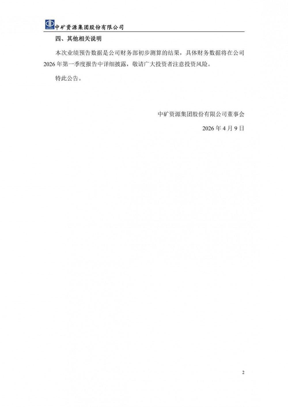 4月9日,中矿资源发布2026年第一季度业绩预告。预计2026年第一季度净利润为5亿元—5.5亿元,比上年同期增长270.97%—308.07%。