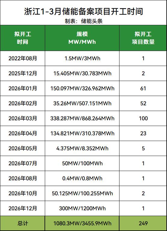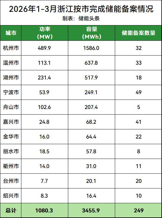 能源圈据公开数据不完全统计,2026年1-3月浙江储能备案项目249个,投资金额82.53亿元,储能备案项目规模1080.3MW/3455.9MWh。