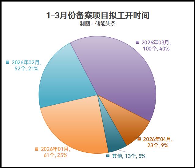 1-3月备案项目中,1月开工61个项目,占25%;2月开工52个项目,占21%的;3月开工100个项目,占40%,4月开工23个项目,占9%;其余月份开工的数量占5%。