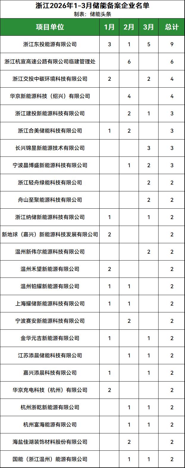 浙江轻舟绿能科技有限公司、舟山至聚能源科技有限公司、浙江纳储新能源科技有限公司、新地球(嘉兴)新能源科技发展有限公司、温州新伟尔能源科技有限公司、温州禾望新能源有限公司、温州铂耀新能源有限公司、上海耀储新能源科技有限公司、宁波赛安新能源科技有限公司、金华元吉新能源有限公司、江苏添晨储能科技有限公司、嘉兴添晨科技有限公司、华京充电科技(杭州)有限公司、杭州浙乾新能源有限公司、杭州富海能源有限公司、海盐佳湖装饰材料股份有限公司、国能(浙江温州)能源有限公司t等企业均备案2个项目;