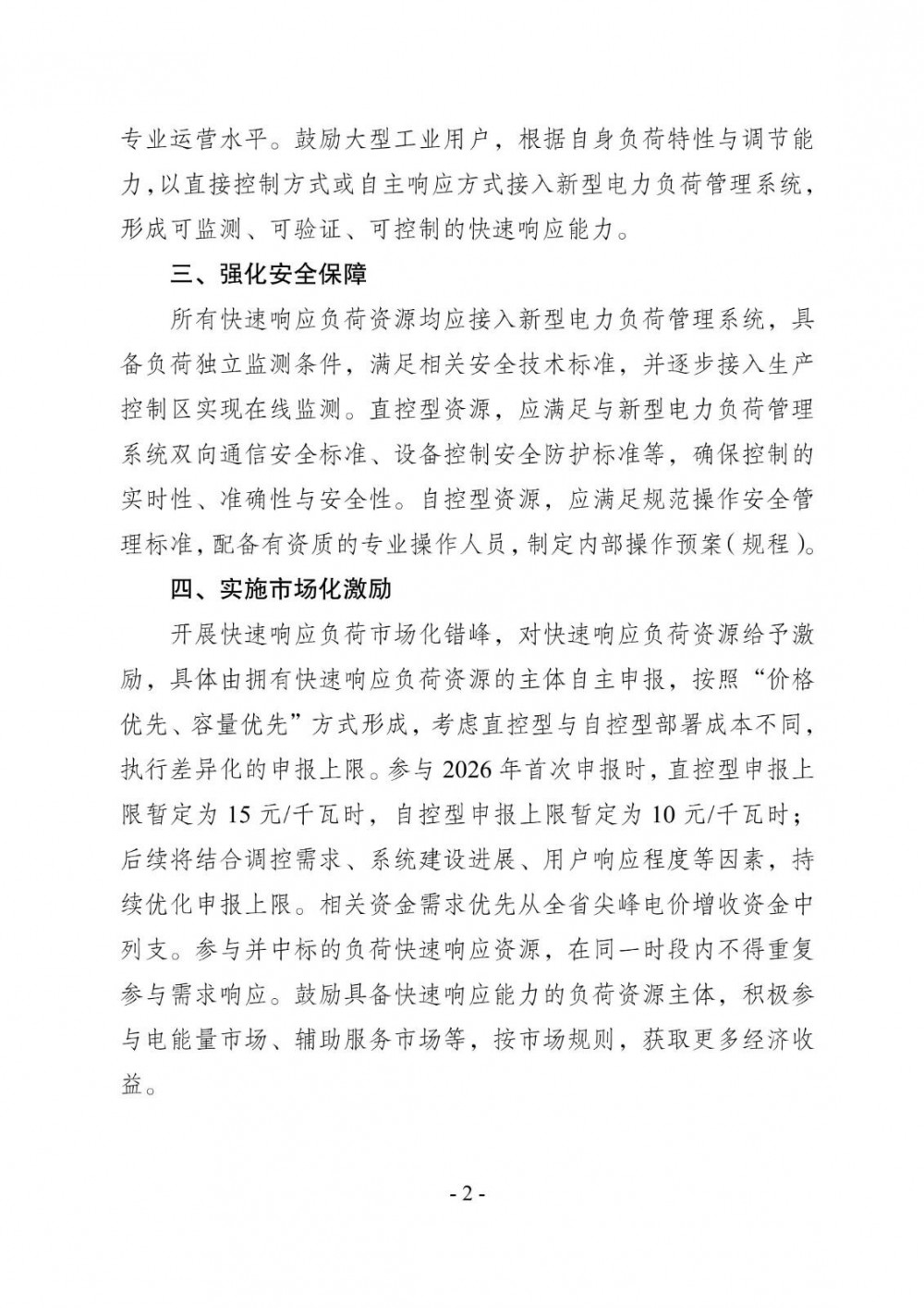 文件提出开展快速响应负荷市场化错峰,对快速响应负荷资源给予激励,按照“价格优先、容量优先”方式,针对直控型与自控型部署成本不同,执行差异化的申报上限。参与2026年首次申报时,直控型申报上限暂定为15元/kWh,自控型申报上限暂定为10元/kWh。