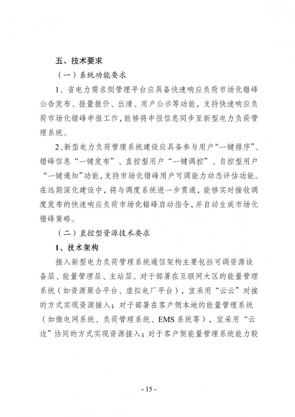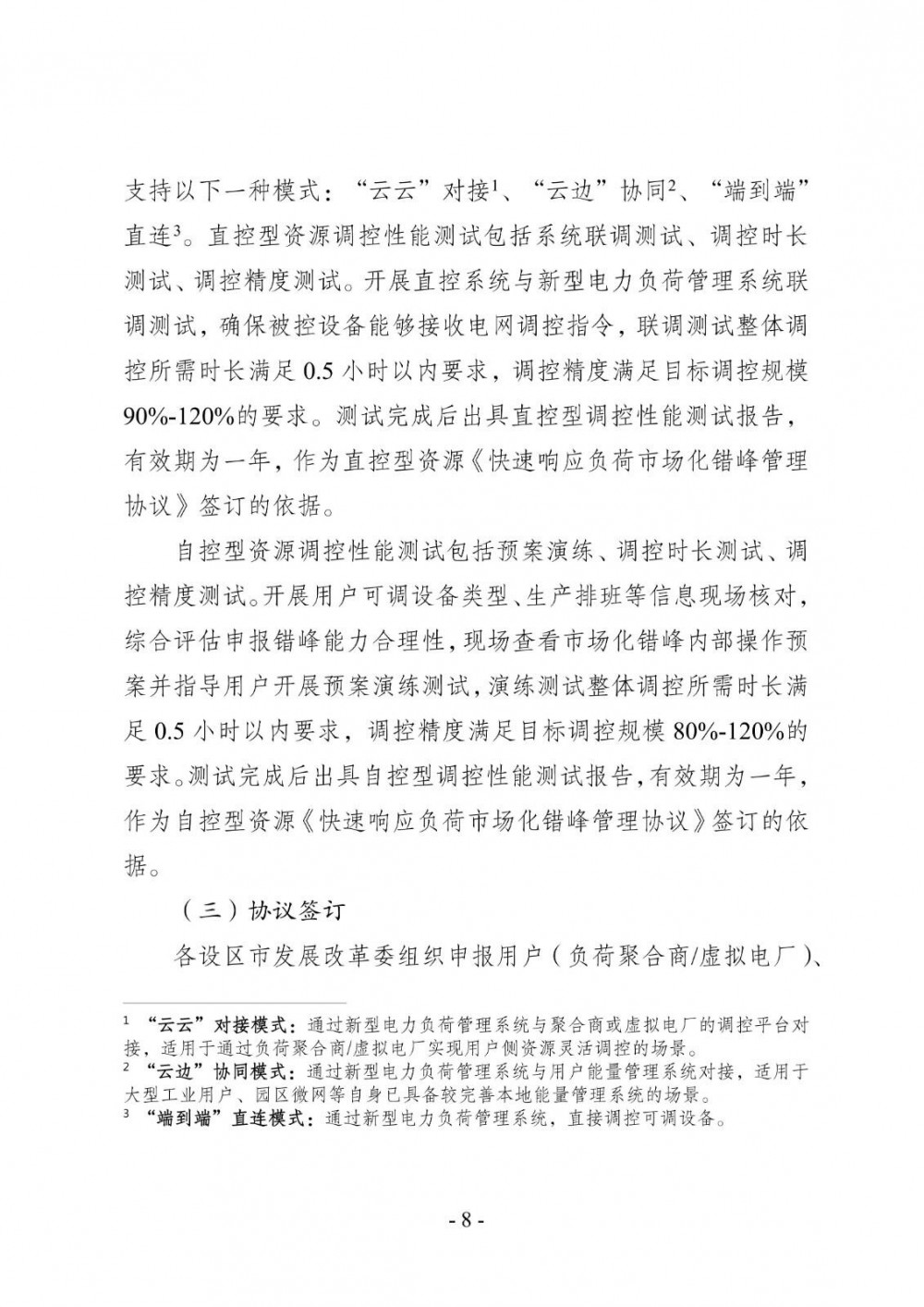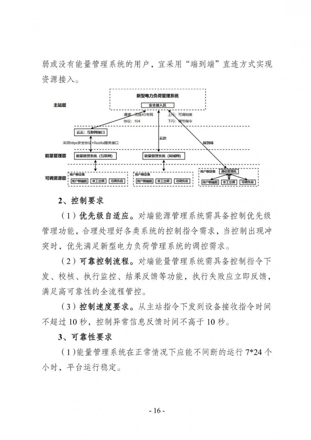 直控型资源接入新型电力负荷管理系统的技术架构须至少支持以下一种模式:“云云”对接’、“云边”协同、“端到端”直连。直控型资源调控性能测试包括系统联调测试、调控时长测试、调控精度测试。开展直控系统与新型电力负荷管理系统联调测试,确保被控设备能够接收电网调控指令,联调测试整体调控所需时长满足0.5小时以内要求,调控精度满足目标调控规模90%-120%的要求。